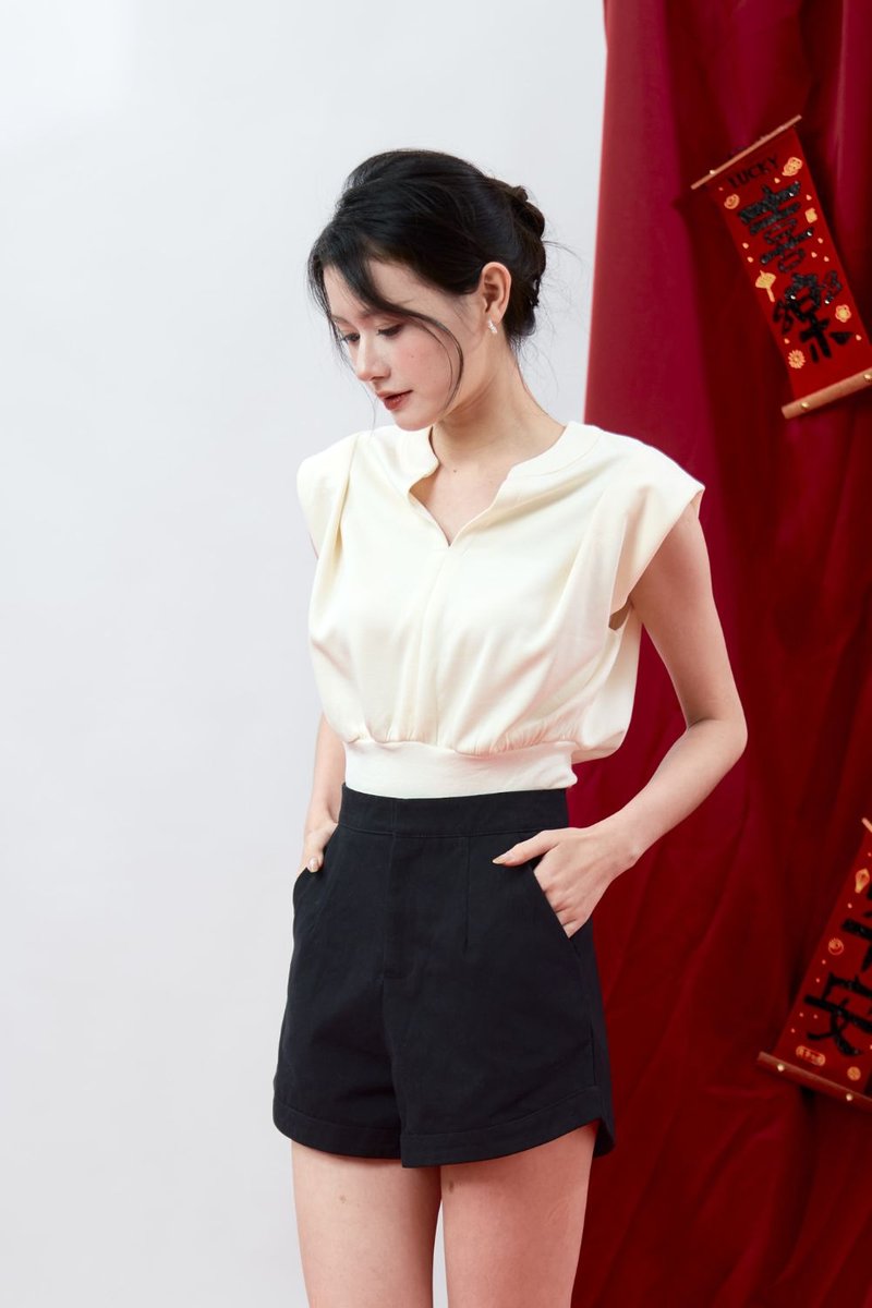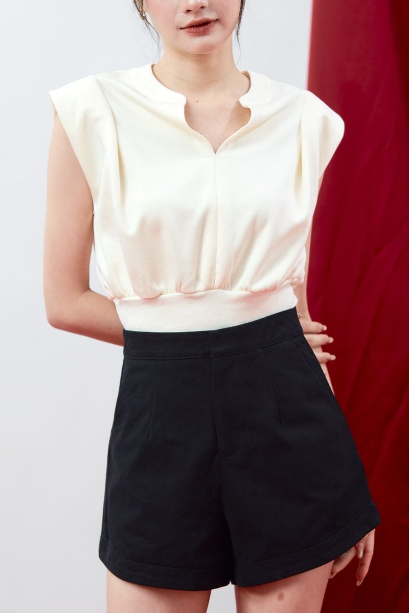 Keywords: Corvella Cotton Twill Shorts, Curved hem leg-lengthening shorts, Non-stretch cotton twill shorts, Slightly fitted tailored shorts, High waist cotton twill shorts, Minimalist curved hem shorts, Smart casual cotton shorts, Front pocket tailored shorts, Zip closure cotton twill shorts, Elongating silhouette shorts