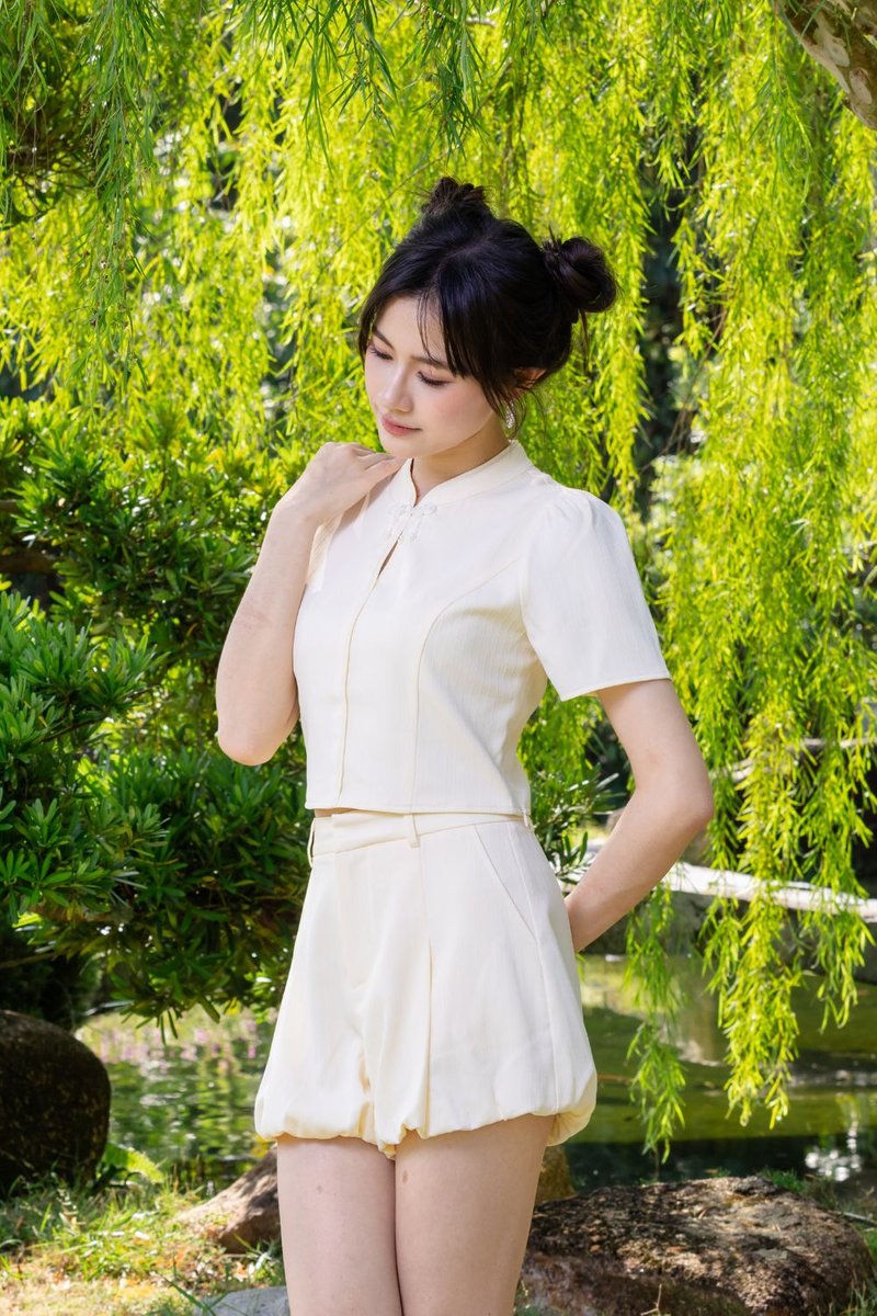 Remie Cotton Blend Bubble Cheongsam Shorts Cream