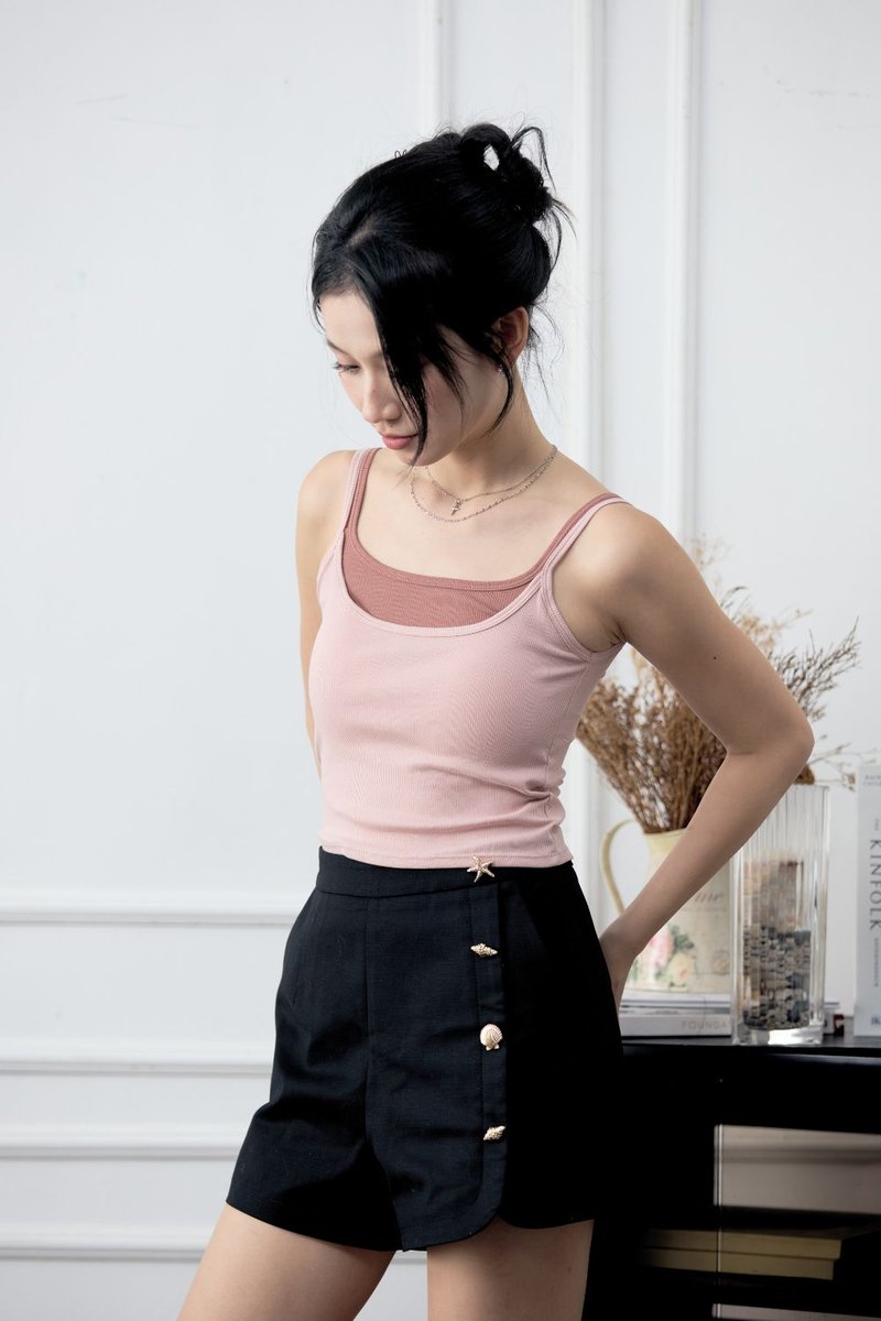The Velyn Shorts offer clean tailoring with a touch of playful charm. Made from a midweight cotton-polyester blend, they stay structured yet comfortable, with a non-sheer and unlined finish for easy everyday wear. A concealed back zip keeps the silhouette sleek, while functional pockets add practicality. The rounded-edge slit at the hem softens the shape, and the cute golden seashell button at the left side brings a subtle statement detail to this versatile pair.