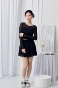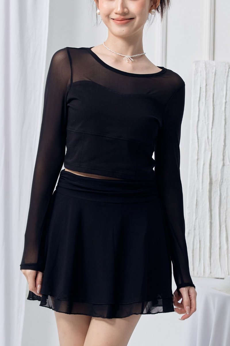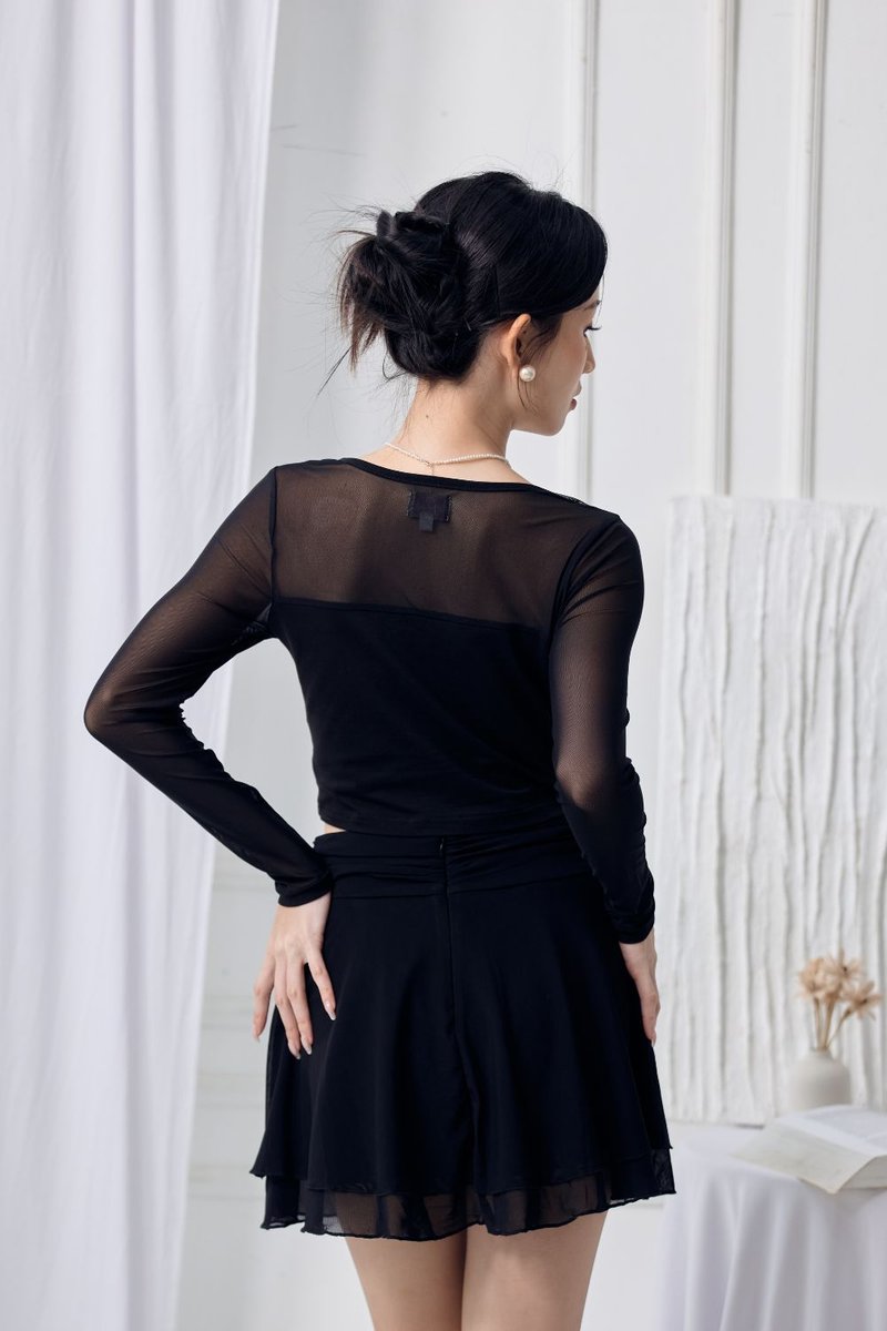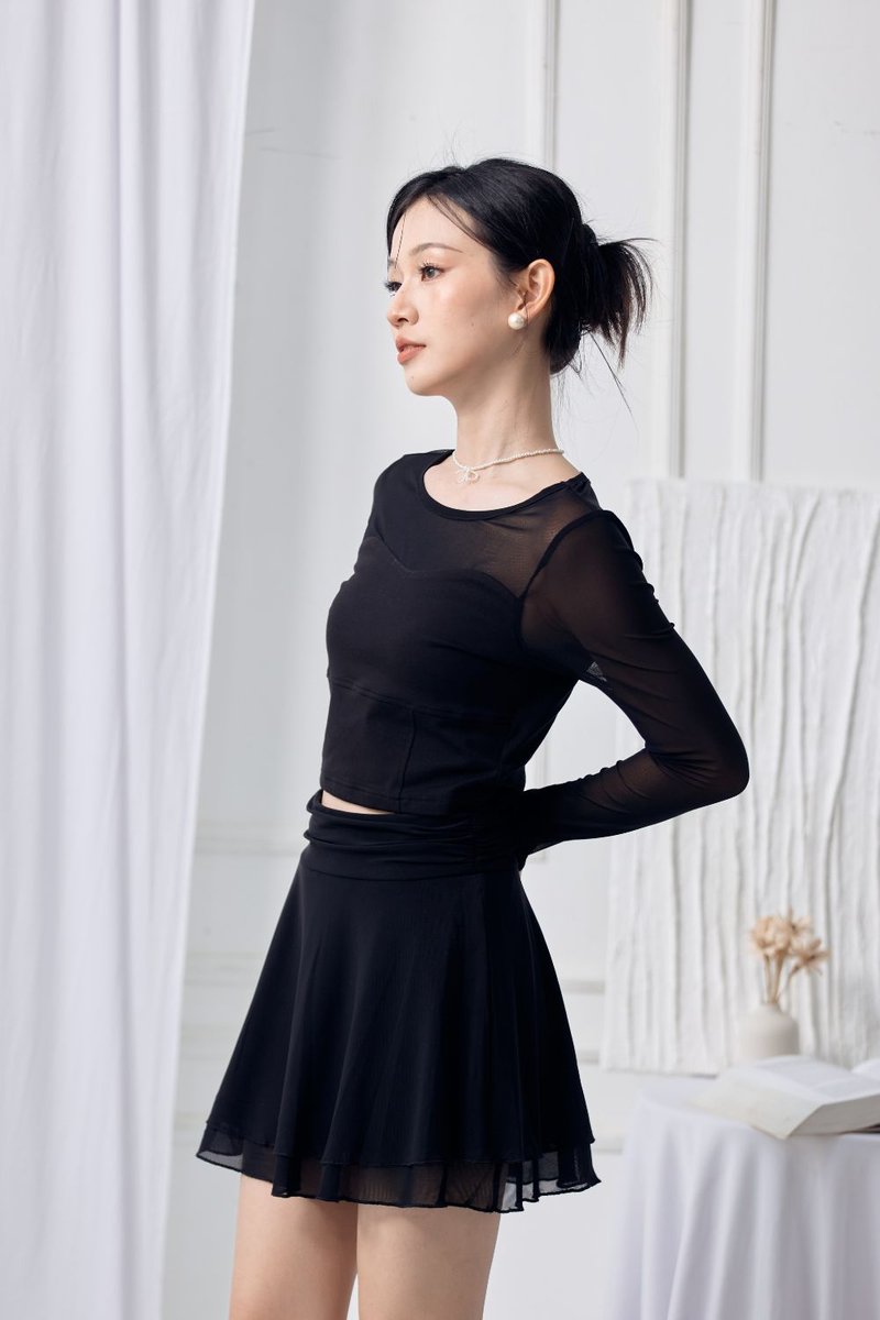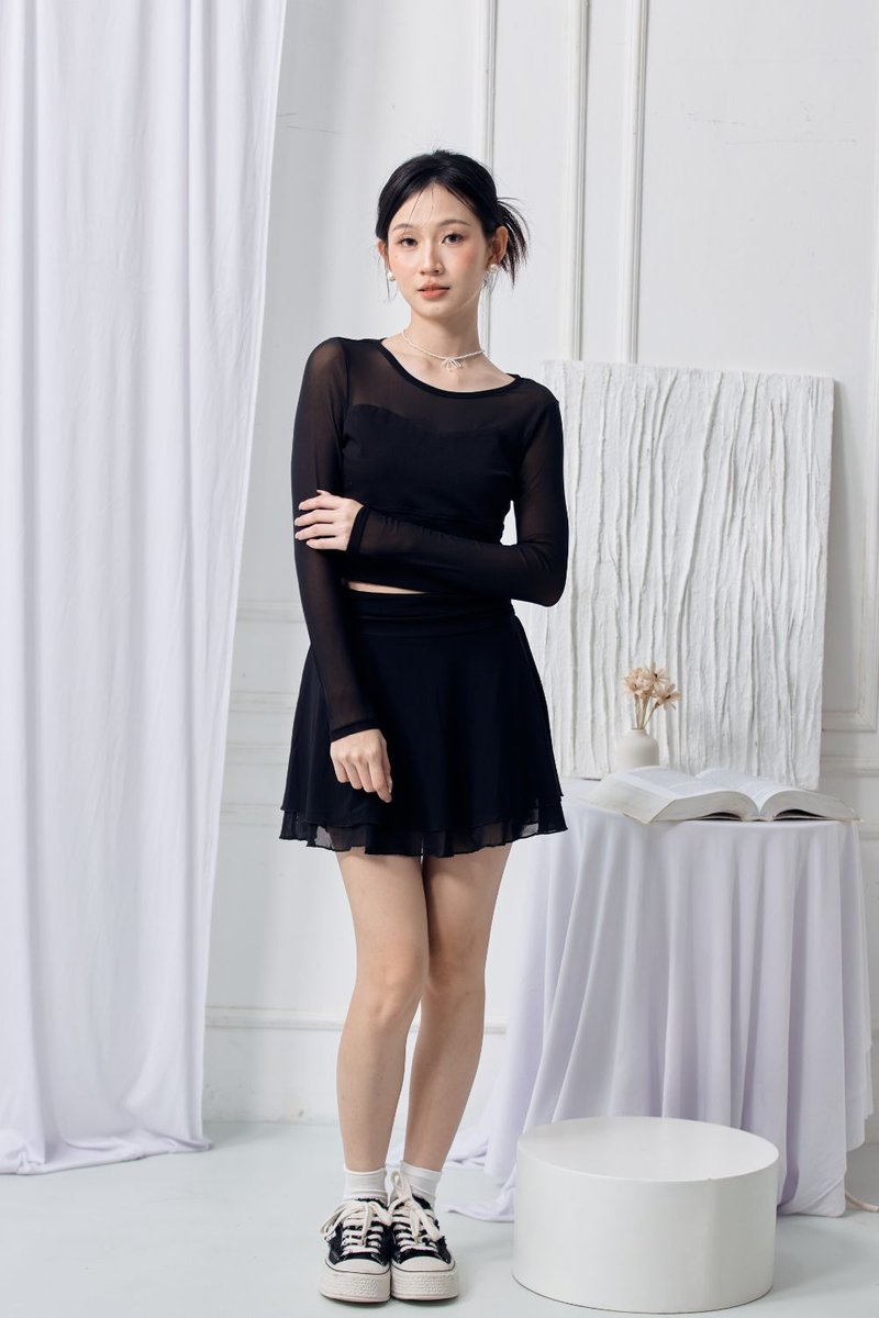 The Arynn Mesh Skirt brings soft movement and a feminine touch to any outfit. Crafted from a lightweight polyester-blend mesh, it offers airy flow while keeping comfort in check with a built-in inner pants lining. The stretchy waistband with shirring adds gentle texture and a flattering fit, while the tiered A-line silhouette creates effortless elegance with every step. Finished with a concealed back zip for a clean look, this piece can be worn on its own or paired with its matching top (13072501) for a coordinated mesh set.