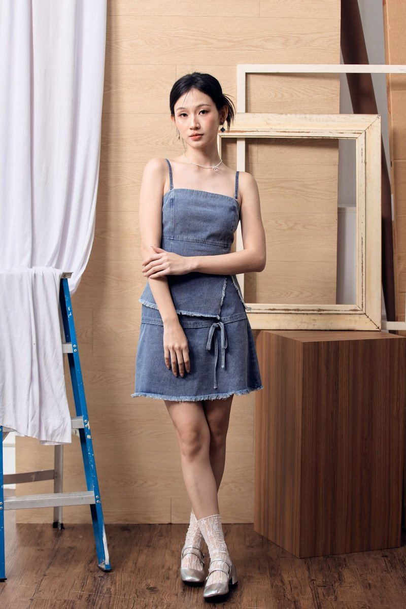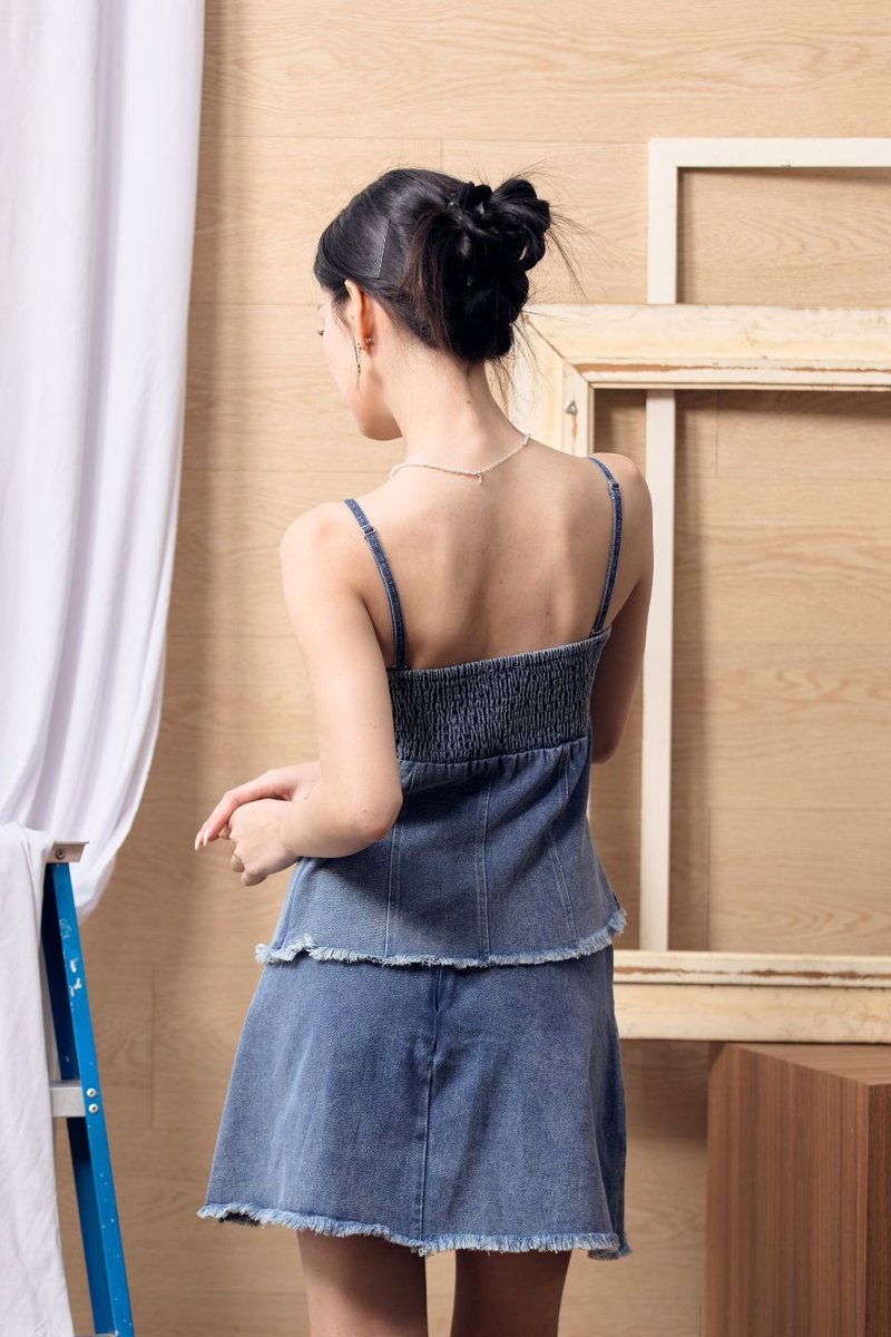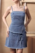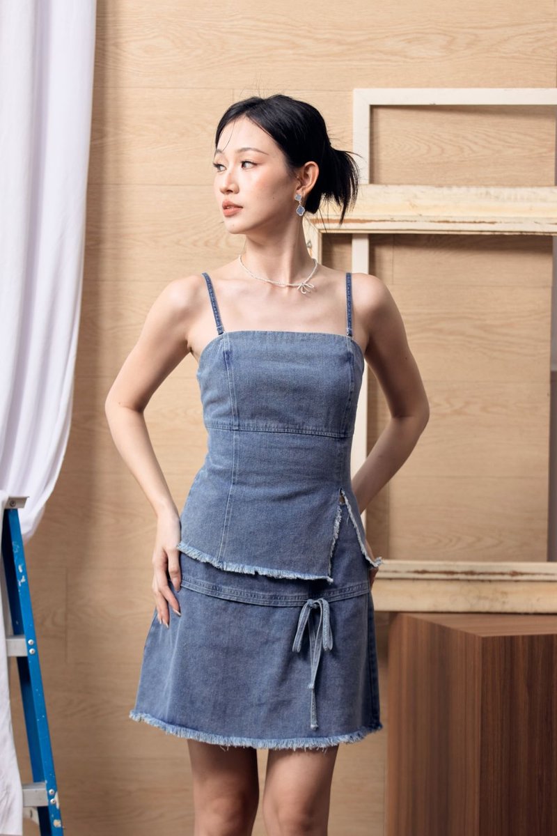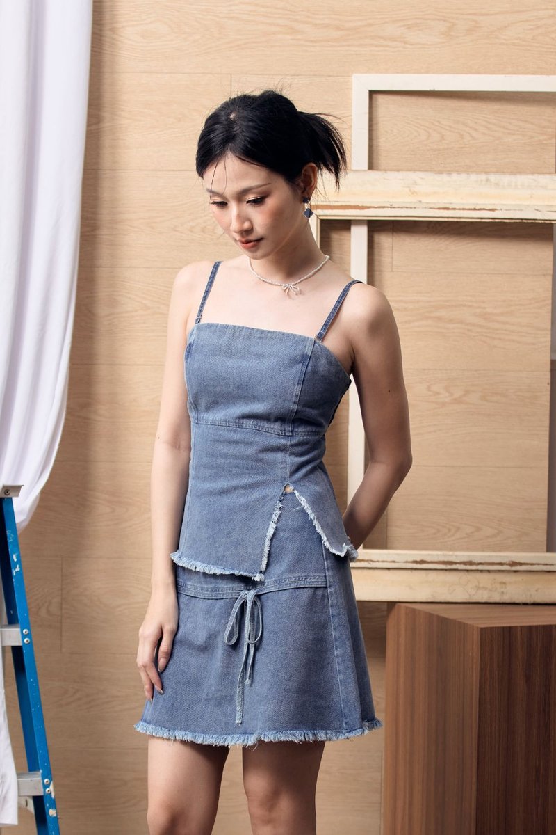 The Alana Frayed Denim Skirt is a playful yet polished piece, crafted from cotton-blend denim with a washed finish for effortless style. Designed with a flattering A-line silhouette, it features a concealed back zipper for seamless wear, while the frayed hem and front denim ribbon detail add a subtle, stylish touch. Fully lined with inner pants for comfort and coverage, this skirt is non-sheer and structured for easy movement. Perfectly paired with its matching top (11052506) or styled with casual tees, it offers versatile looks for day-to-day outings.