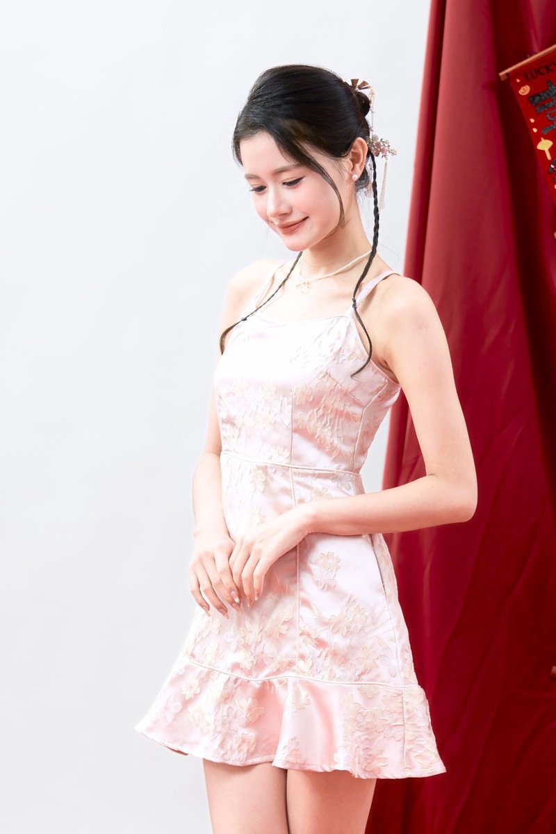 The Liyra Floral Soft Jacquard Dress is a graceful and feminine piece, crafted from soft-touch floral jacquard fabric that feels gentle and non-irritating on the skin. Designed with a sleeveless silhouette and adjustable straps, it offers a comfortable, customizable fit. Fully lined and non-sheer, this dress features tone-on-tone piping details for a refined finish, functional pockets for everyday ease, and a peplum flare hem that enhances movement. The slightly fitted bodice flows into a flattering flared silhouette, making it an elegant yet wearable choice for both casual outings and special occasions.