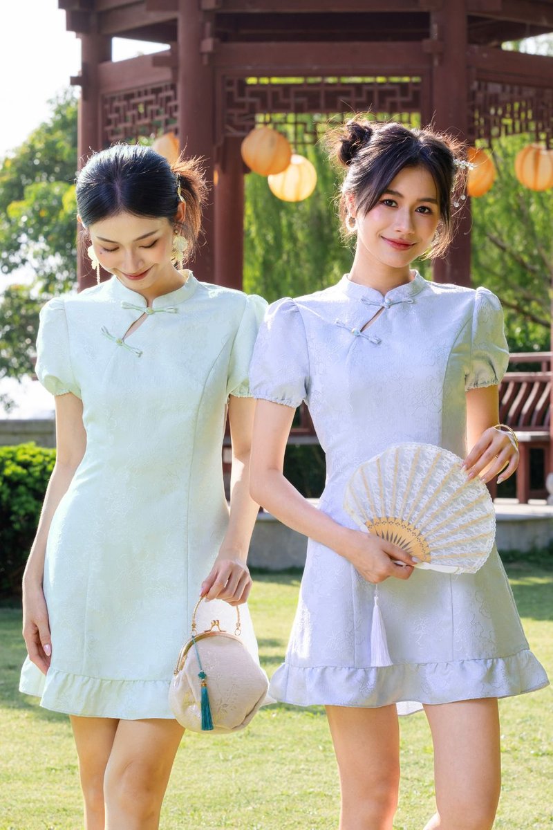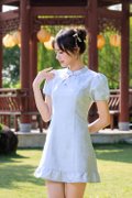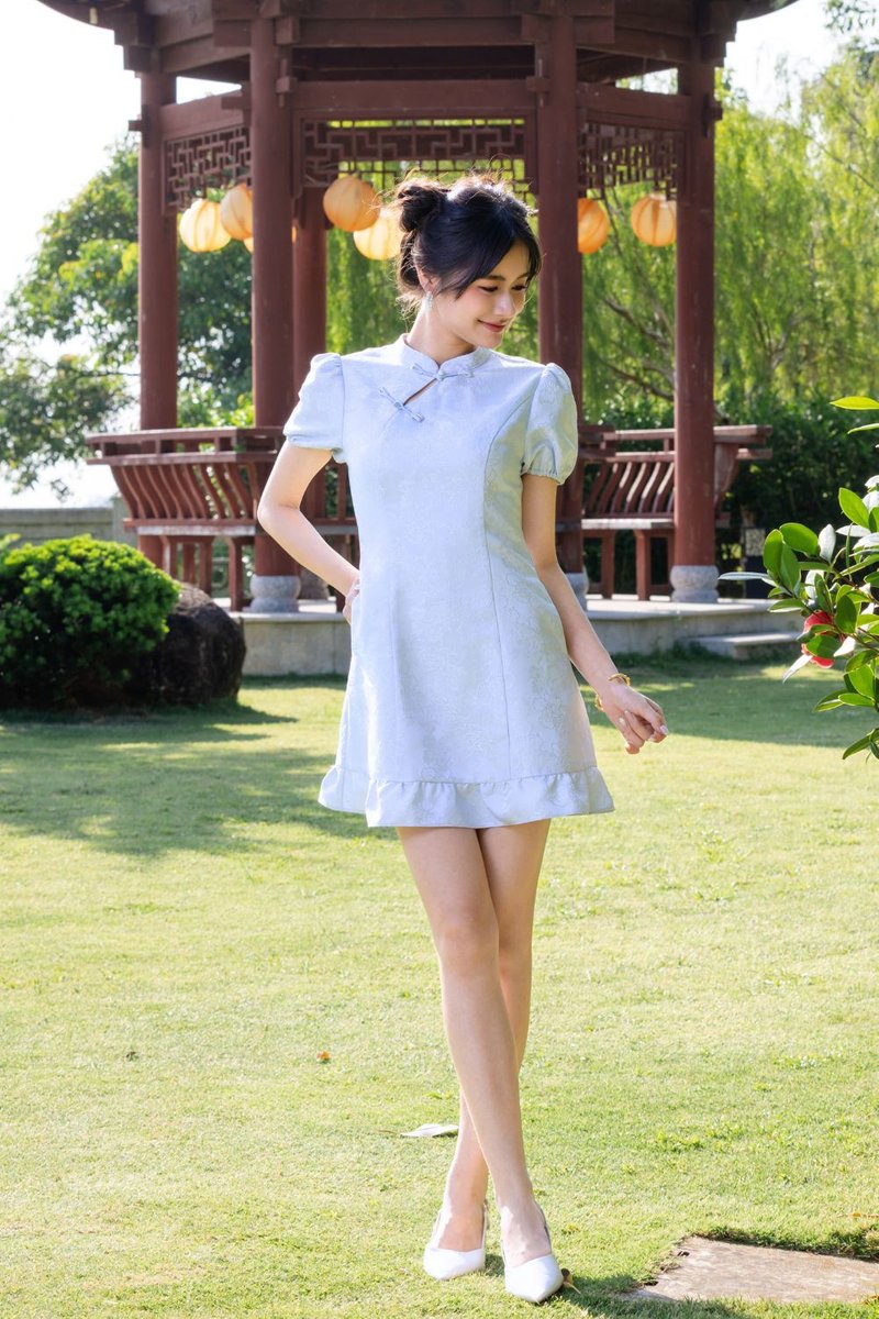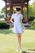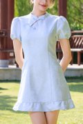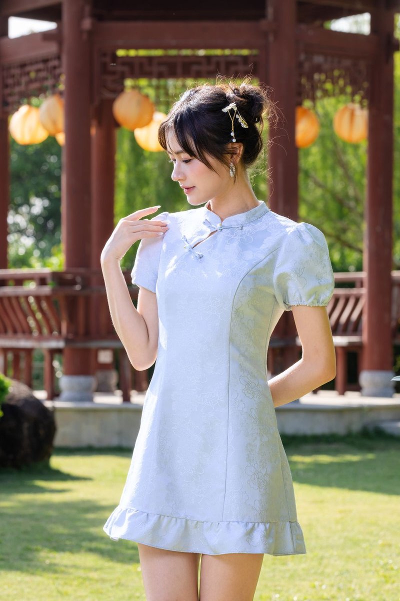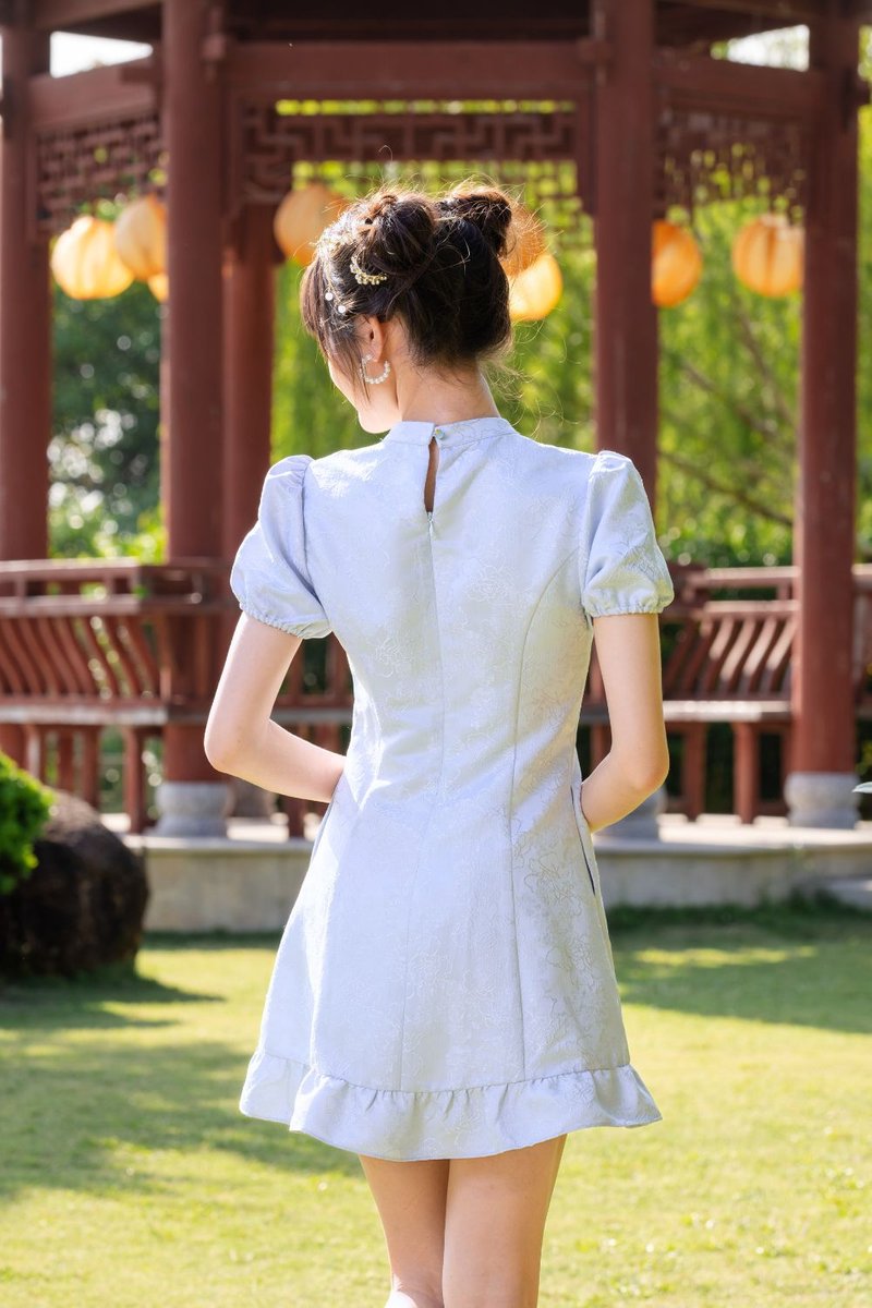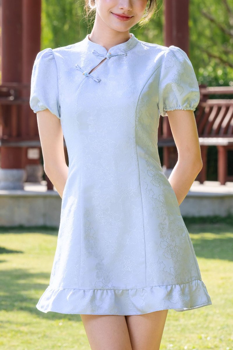 Virelith Cheongsam Dress With Lotus Hem Light Blue