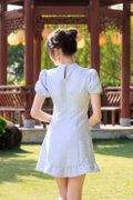 The Virelith Cheongsam Dress with Lotus Hem presents a refined silhouette accented with delicate traditional elements. Made of mid weight non stretch jacquard fabric and fully lined with woven polyester blend lining, it offers a structured yet comfortable finish. Decorative chinese knots in front neck highlight the cheongsam-inspired design, while slight gathers in sleeve head for puff effect and elasticated cuffs add gentle volume to the sleeves. Practical details include two pockets in side seams and an invisible zip opening in centre back with button end detail for a neat closure. Designed to be worn fitted, the dress delivers a polished and elegant look.