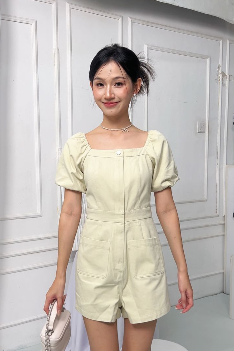 The Lennie Square Neck Puff Sleeve Cotton Twill Romper is a perfect mix of classic charm and playful femininity. Made of cotton twill material, it offers a structured yet breathable fit ideal for all-day wear. Featuring a square neckline with elastic puff sleeves, it frames the shoulders beautifully while adding a romantic touch. The back elastic and waist smock panel ensure a comfortable snug fit, enhancing your silhouette effortlessly. Detailed with custom Purpur’s metal buttons and a zip closure at the center front, this romper also includes two front patch pockets for a casual-chic vibe. The upper body is fully lined with soft knit material, while the slightly fitted top and A-line bottom create a flattering, balanced look.
