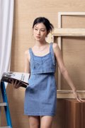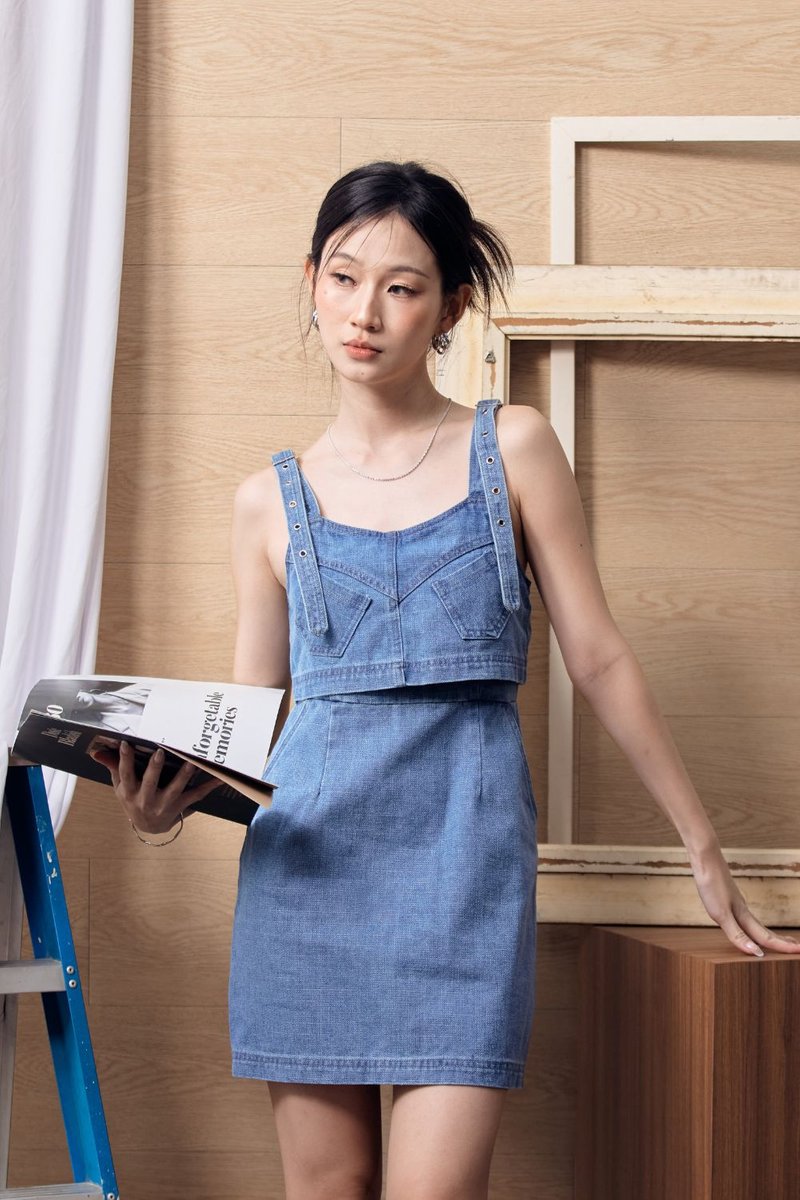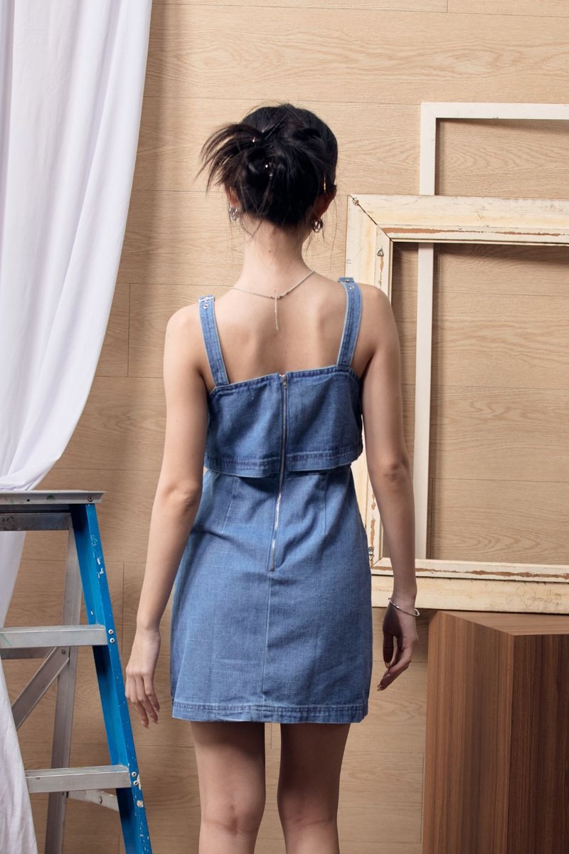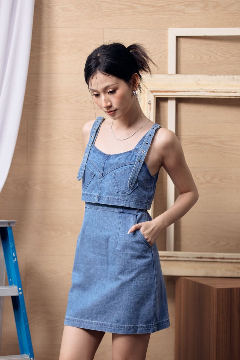 The Vienna Denim Dress brings together clean structure and effortless charm in a timeless A-line silhouette. Crafted from a cotton-blend textured denim, it offers a classic washed finish with a sturdy, non-stretch feel that holds shape beautifully. The sleeveless design and adjustable buckle straps let you customise the fit, while the metal zip at the back makes slipping in and out easy and seamless. Functional front pockets — including a mini bust pocket — add a playful utilitarian touch. Unlined, non-sheer, and designed in a flattering A-line cut, this mini dress is your go-to for casual days, café dates, and weekend strolls.