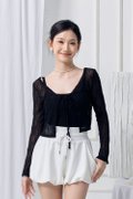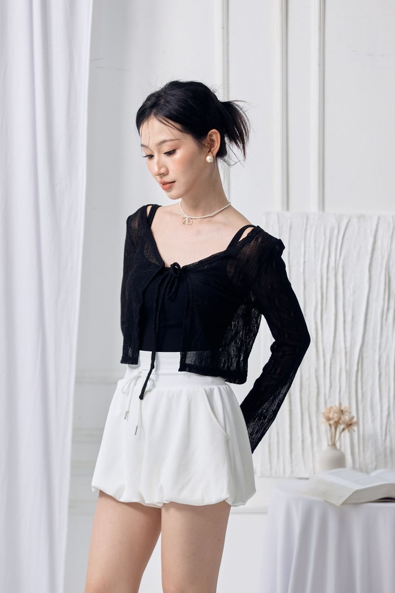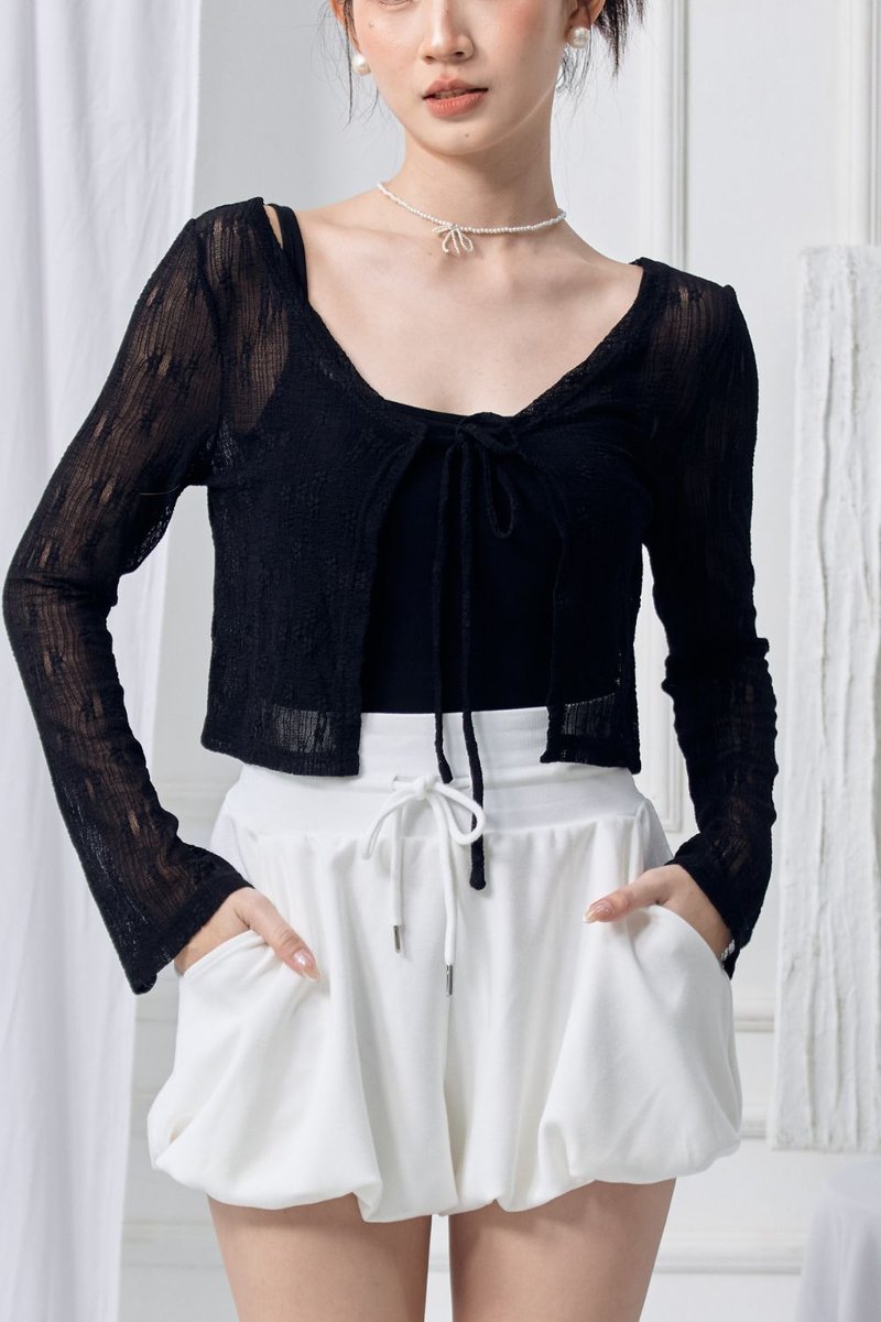 Delicate and romantic, the Evienne Lace Tie Cardigan brings a soft, vintage-inspired charm to your layering essentials. Made from sheer lace with slight stretch, it’s designed in a slightly loose fit with a cropped hem for a flattering, lightweight feel. The center front self-tie closure and small flared sleeves add graceful movement, making it perfect for styling over camisoles, slip dresses, or bralettes. Whether for date nights or relaxed weekends, this piece adds an effortlessly feminine finish to any look. Kindly note that innerwear is not included.