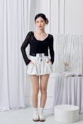 Model P is HEIGHT 165CM, PTP 14.4”, WAIST 12.8”, HIPS 17.6”, wearing size S.