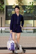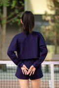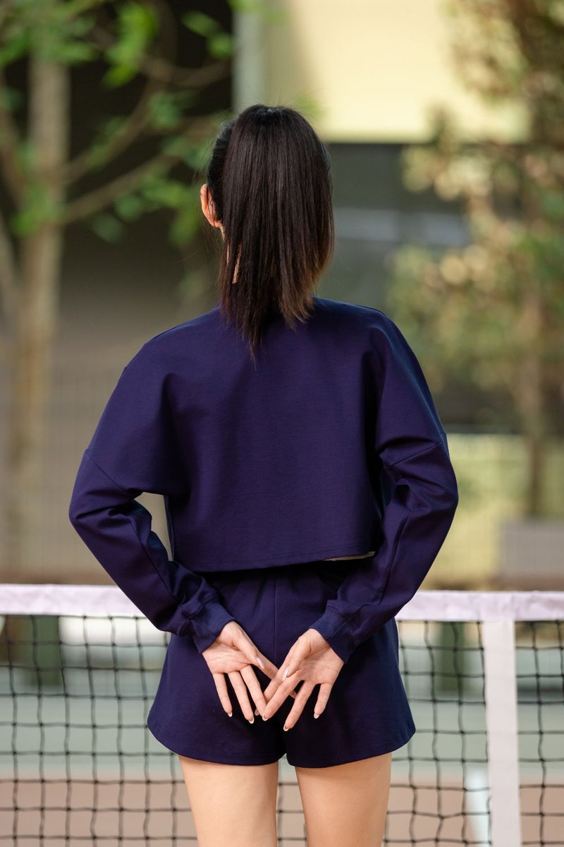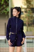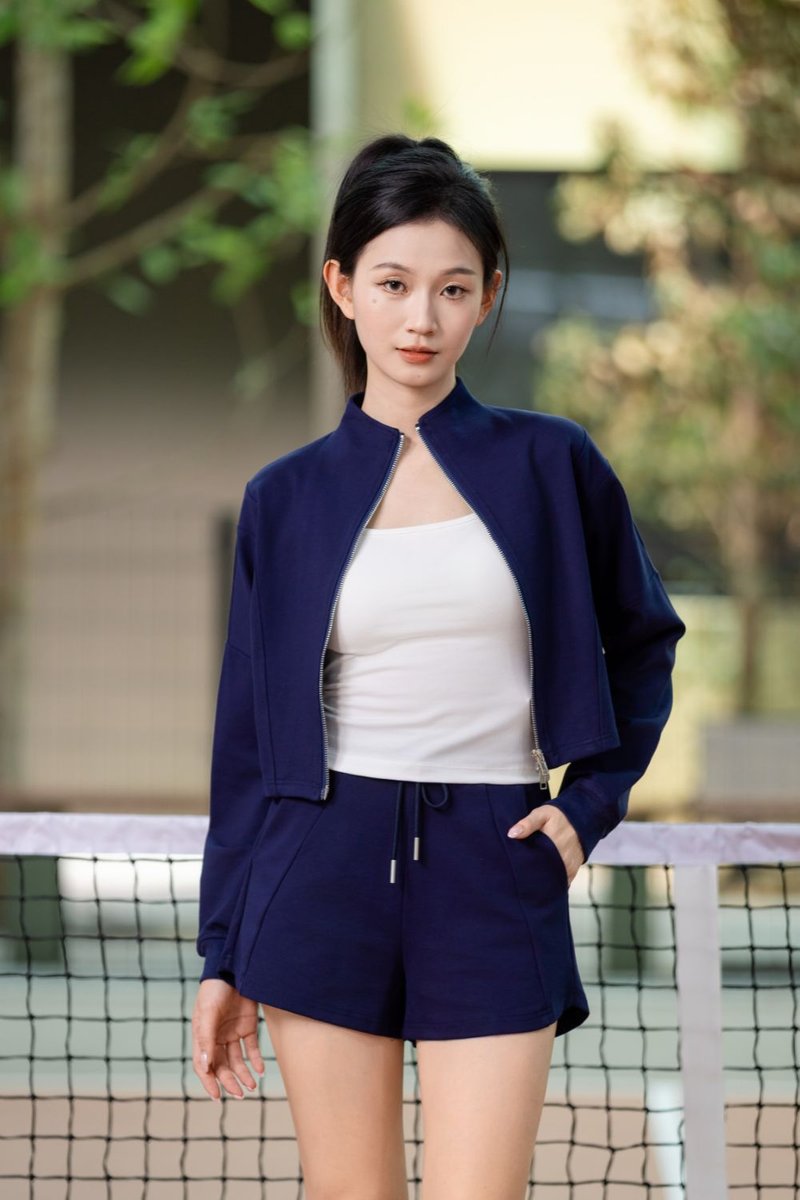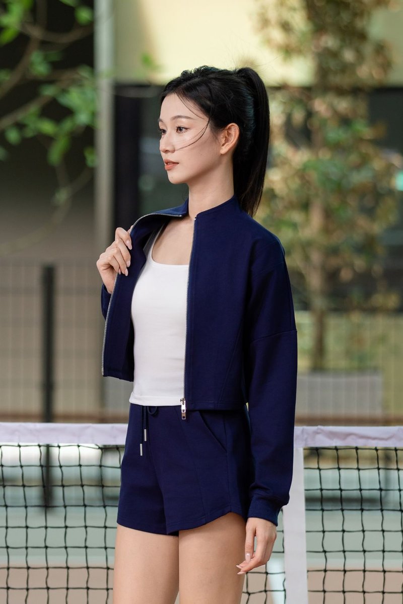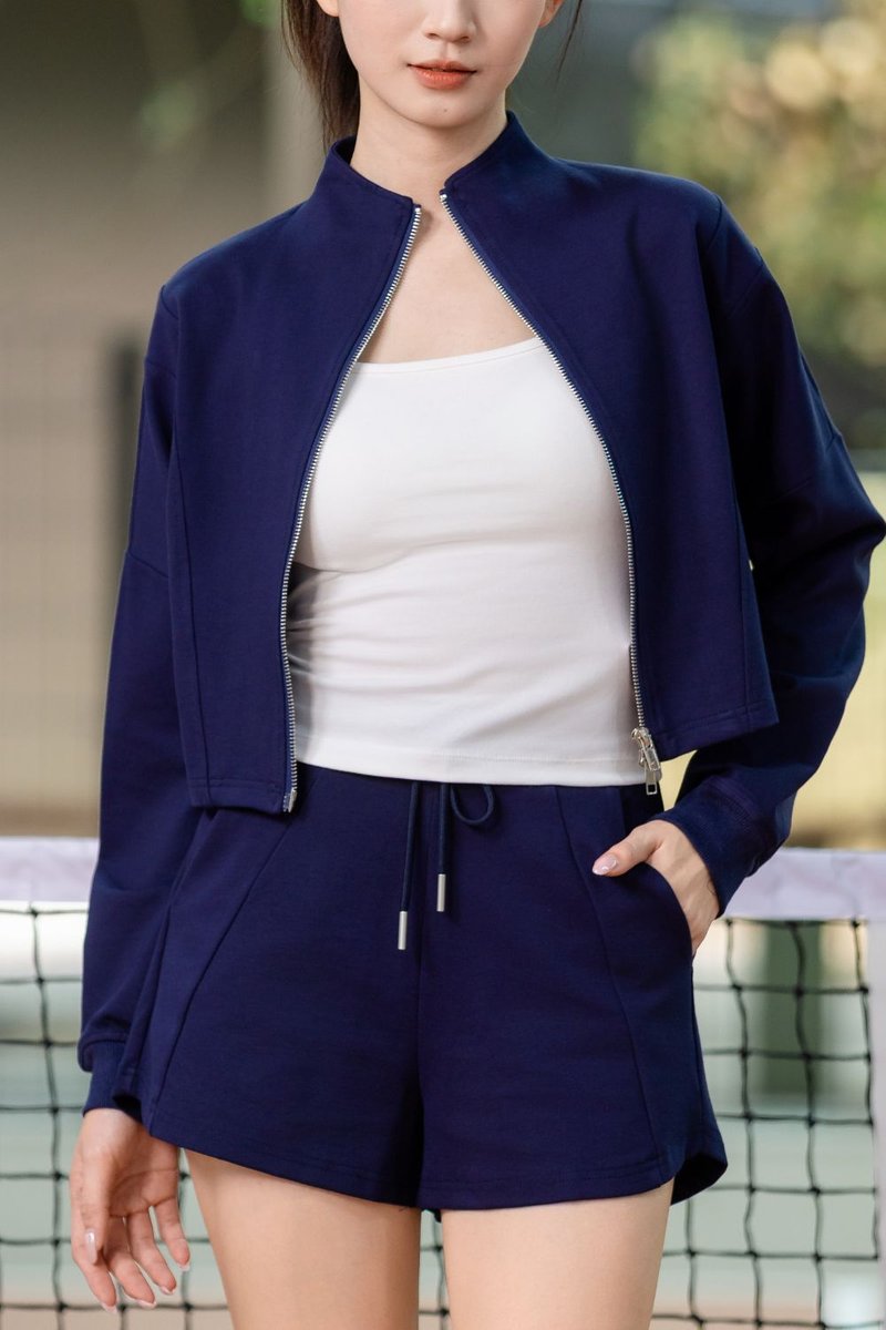 Rivena Athleisure Two Way Zip Jacket Top is a sporty-chic essential designed for both comfort and styling versatility. Made of 260g ponte de roma cotton material, it offers structure while maintaining a soft and comfortable feel. Dart lines throughout the front create a slimmer look, enhancing the overall silhouette. Featuring a 2 way metal zipper for more styling options, it allows flexible wear. The drop shoulder design adds a relaxed touch, while the ribbing sleeve hem creates a snug in effect. Worn slightly loose with crop length, it delivers a modern athleisure proportion.