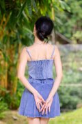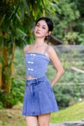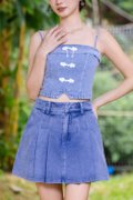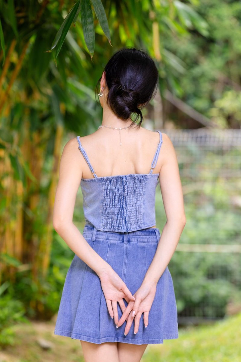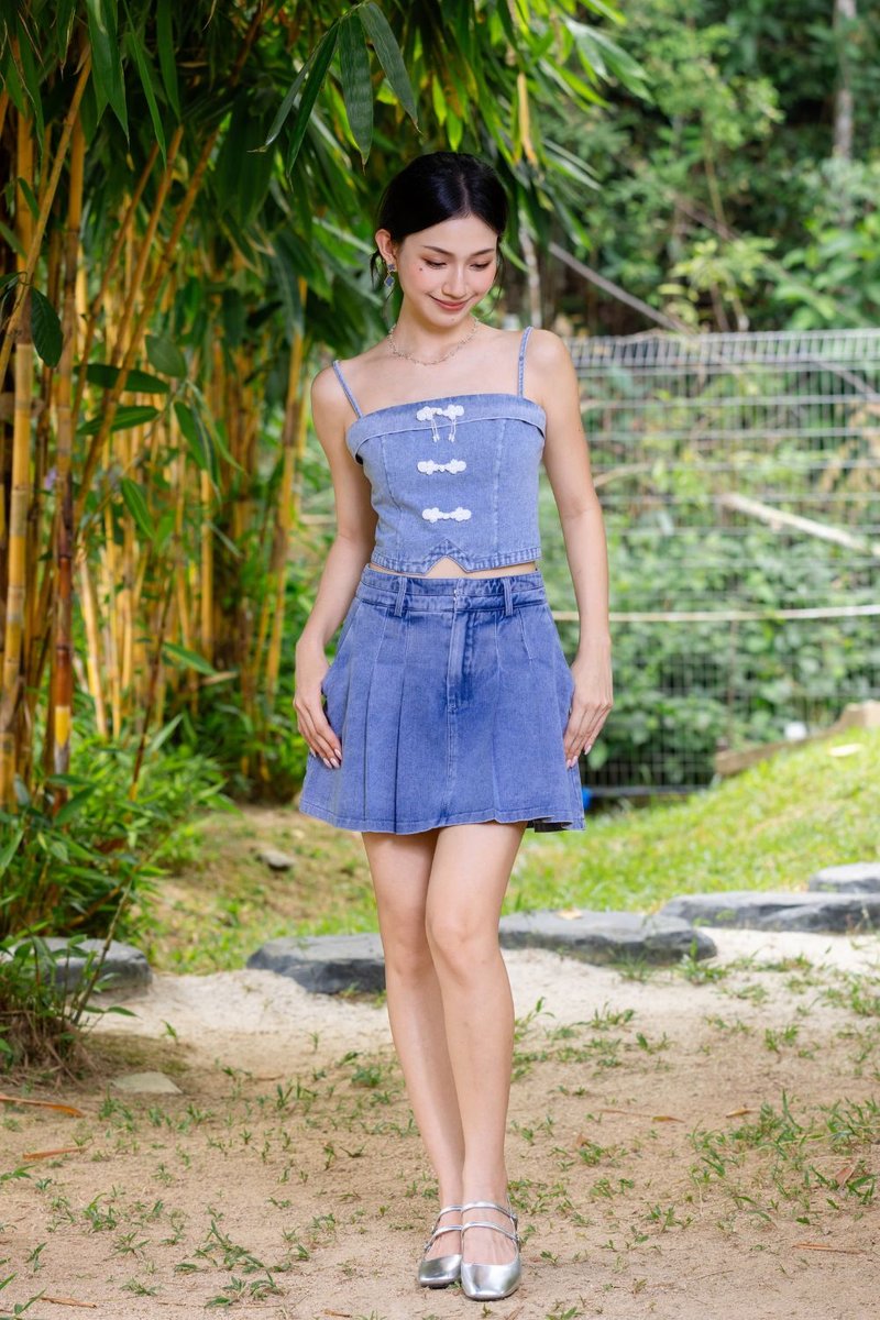 The Calantha Crop Top infuses classic cheongsam elements with modern denim edge. Made from acid wash effect denim, it offers a chic and fitted silhouette. The design features a V-cut detail at the centre front hem, elegantly paired with decorative contrast Chinese knots above. A full panel of shirring at the centre back provides a flattering stretch and allowance, while adjustable straps ensure a customized fit. An open-end zip in the centre back allows for easy wear.