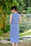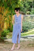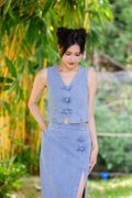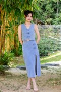 The Calantha Cheongsam Denim Midi Skirt blends classic Eastern motifs with a contemporary denim look. Made from denim with an acid wash effect, it features a slightly fitted silhouette that flows into an elegant midi length. Signature decorative Chinese knots adorn the front, adding a touch of tradition. Practicality is woven into the design with two side seam pockets and a functional side slit for ease of movement. A smooth zip opening at the centre back seam ensures a clean finish.