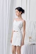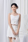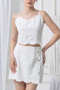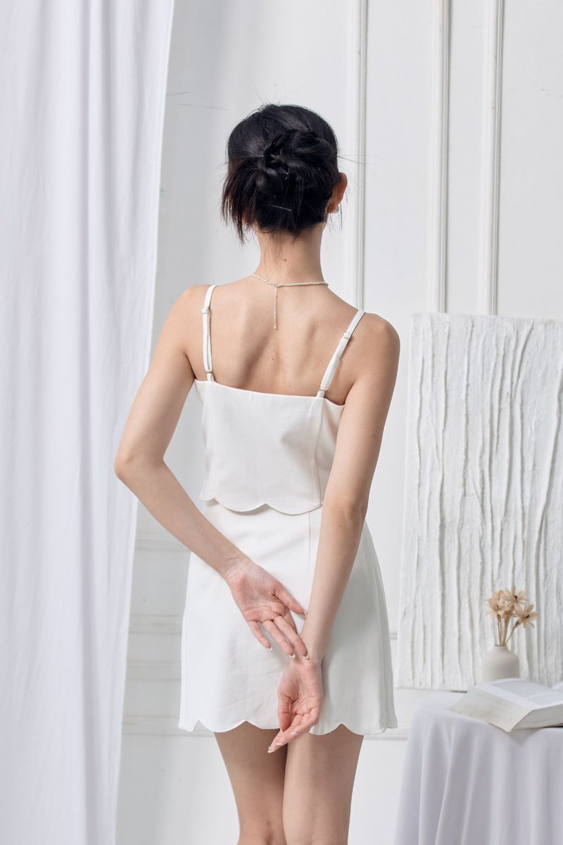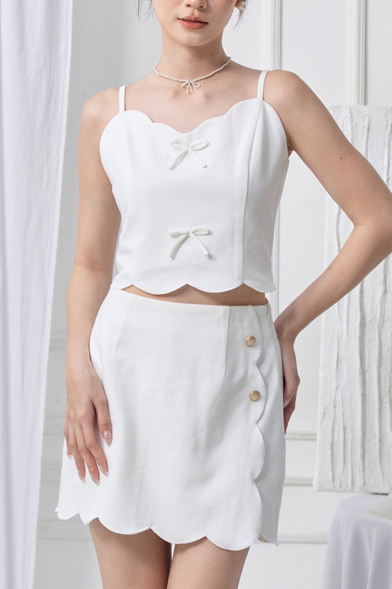 The Lioré Scallop Spaghetti Top is a refined yet playful piece crafted from mid-weight polyester blend twill suit fabric for a polished look with structured elegance. Designed with delicate scallop edging along the neckline and hem, it adds a soft feminine touch, while the decorative bow at the front enhances its charming appeal. Featuring adjustable spaghetti straps and a cropped length, this sleeveless top offers a comfortable regular fit that’s easy to style. Wear it on its own for a chic minimal look or pair it with its matching bottom for a coordinated set—effortless, versatile, and timeless.