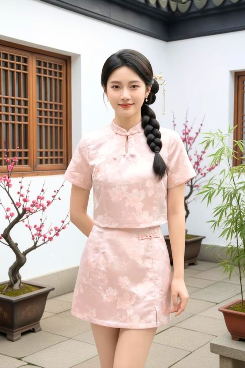The Lunéa Jacquard Cheongsam Top is a feminine, oriental-inspired piece crafted from floral jacquard weave fabric with gold thread detailing for a luxurious texture and subtle shimmer. Designed as part of a set with the Jacquard Cheongsam Skirt, it features a mandarin collar with a peephole and intricate Chinese knot buttons adorned with floral and crystal beading, adding delicate elegance. Fully lined, including the sleeves and collar, the top ensures the jacquard will not itch the skin. An additional flyer under the open-end metal zip prevents direct contact with the body for comfort. Worn slightly loose and cropped in length, it provides a flattering and comfortable silhouette while maintaining traditional charm.