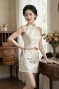 The Lunéa Jacquard Halter Cheongsam Top is a sophisticated, oriental-inspired piece crafted from floral jacquard weave fabric with gold thread detailing, creating a luxurious texture with subtle shimmer. Designed as part of a set with the Lunéa Jacquard Cheongsam Skirt, this sleeveless halter version offers an alternative to the sleeved Jacquard Cheongsam Top. Intricate Chinese knot buttons adorned with floral and crystal beading add a delicate, feminine touch. The top features a halter curve at the armhole for coverage and comfort, complemented by a visual overlap design at the front. Fully lined, including the collar, it ensures the jacquard does not itch the skin, while an additional flyer under the open-end metal zip prevents direct contact with the body for convenient and comfortable wear.