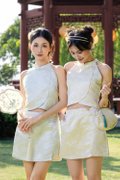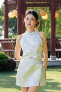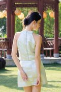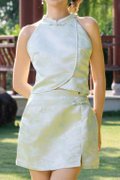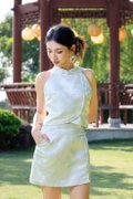 The Lunéa Jacquard Halter Cheongsam Top is a sophisticated, oriental-inspired piece crafted from floral jacquard weave fabric with gold thread detailing, creating a luxurious texture with subtle shimmer. Designed as part of a set with the Lunéa Jacquard Cheongsam Skirt, this sleeveless halter version offers an alternative to the sleeved Jacquard Cheongsam Top. Intricate Chinese knot buttons adorned with floral and crystal beading add a delicate, feminine touch. The top features a halter curve at the armhole for coverage and comfort, complemented by a visual overlap design at the front. Fully lined, including the collar, it ensures the jacquard does not itch the skin, while an additional flyer under the open-end metal zip prevents direct contact with the body for convenient and comfortable wear.