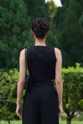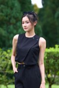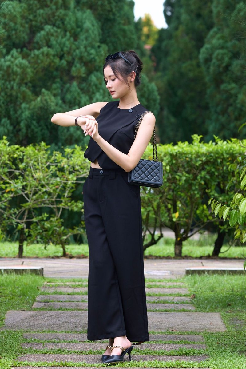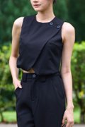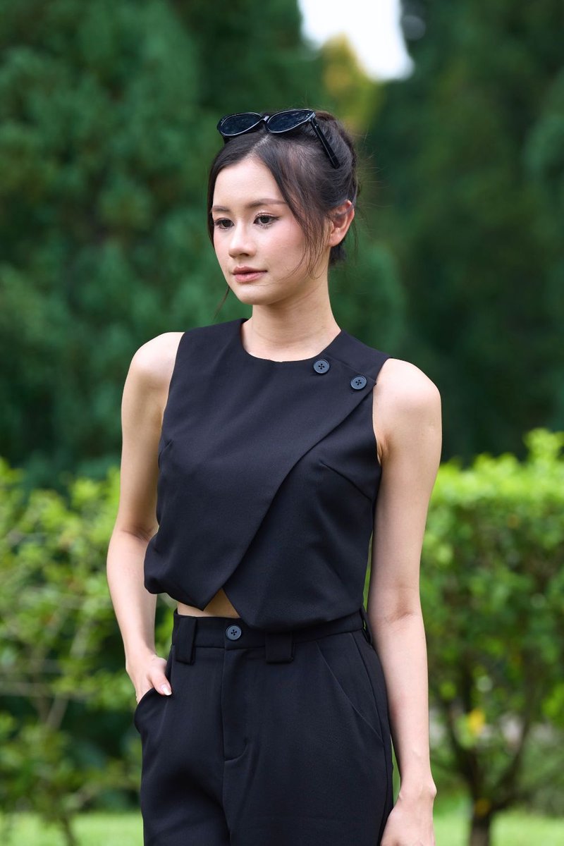 The Mortricia Overlapped Sleeveless Top redefines sleek sophistication with a modern twist. Designed with an overlapping front panel, it secures neatly with two functional buttons at the chest, while the adjustable inner button and elastic detail provide comfort and flexibility at the bust. Cut from a polyester-blend suiting fabric, this top holds its clean structure yet remains lightweight. Fully lined with a woven finish for added refinement, it features a rounded neckline and a slightly cropped length that pairs effortlessly with high-waisted bottoms. The perfect minimalist piece to elevate both workwear and casual edits.