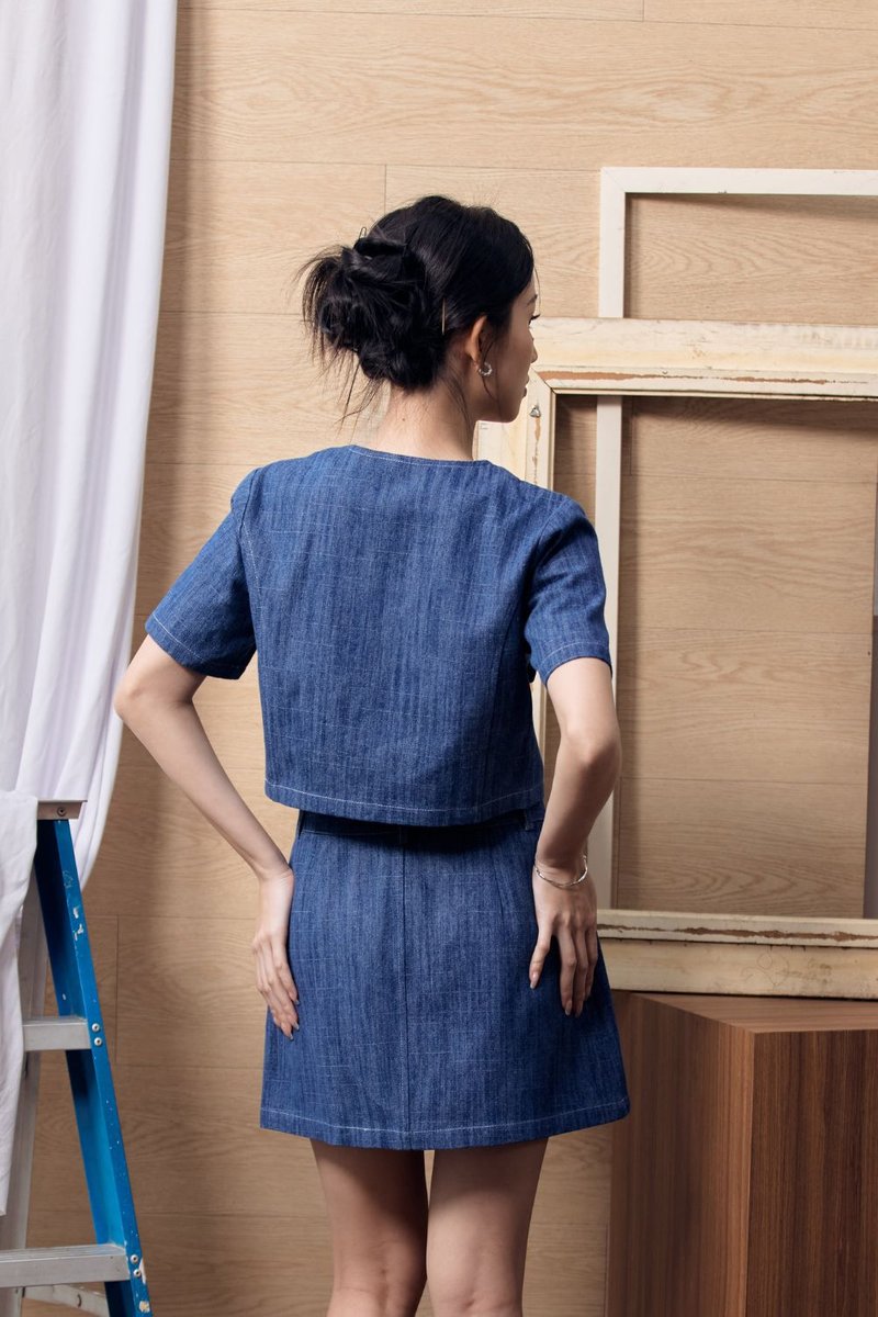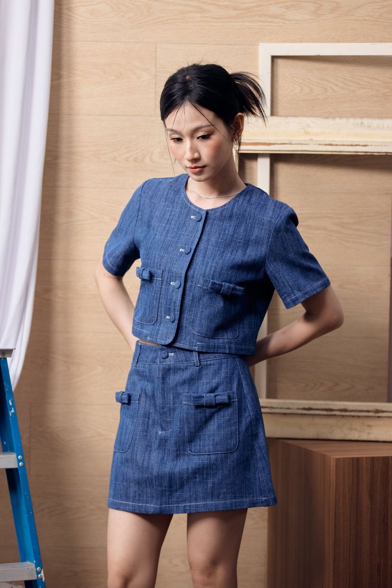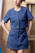 The Whitney Denim Top delivers an easy blend of structure and everyday charm, crafted from a cotton-blend textured denim that holds its shape while staying comfortable. Designed in a slightly relaxed, cropped silhouette, it features a clean round neckline and short sleeves for a casual yet polished look. The front is finished with self-fabric buttons for a seamless denim-on-denim feel, while the patch pocket with a decorative ribbon adds a soft, feminine touch. Unlined, non-sheer, and versatile, it can be worn on its own or styled as a light outerwear layer. Pair it with its matching bottom (47072501) for a coordinated denim set.