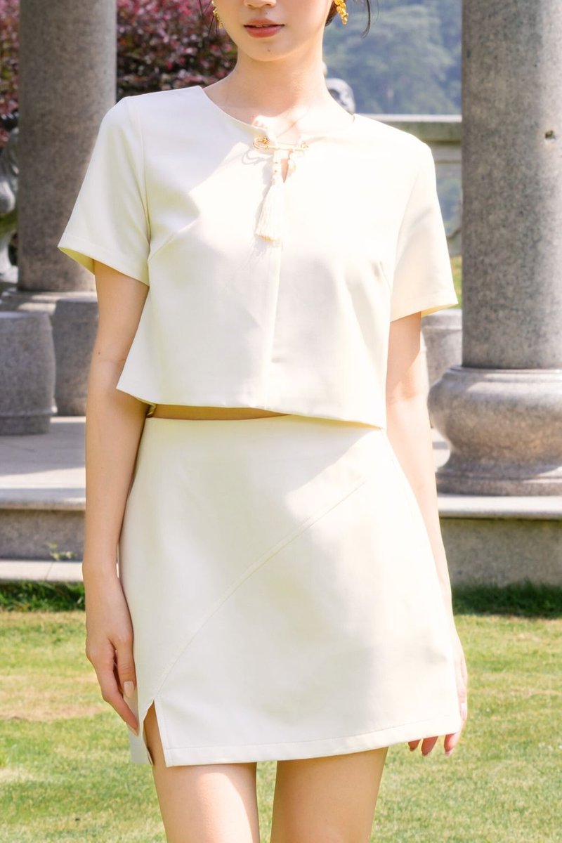 The Zeraphine Asymmetrical Slit A-Line Skirt is a versatile, oriental-inspired piece crafted from polyester-blend material. Designed to pair seamlessly with the Removable Chinese Tassel Pin Top for a sleek and polished look, the fabric undergoes interfacing to achieve a more structured and premium appearance. Featuring one side pocket and asymmetrical lines that flow into a small slit, this basic A-line skirt is subtly elevated with design detail. Fully lined with thick knit shorts for comfort and coverage, it is completed with an invisible back zip closure for a clean finish.