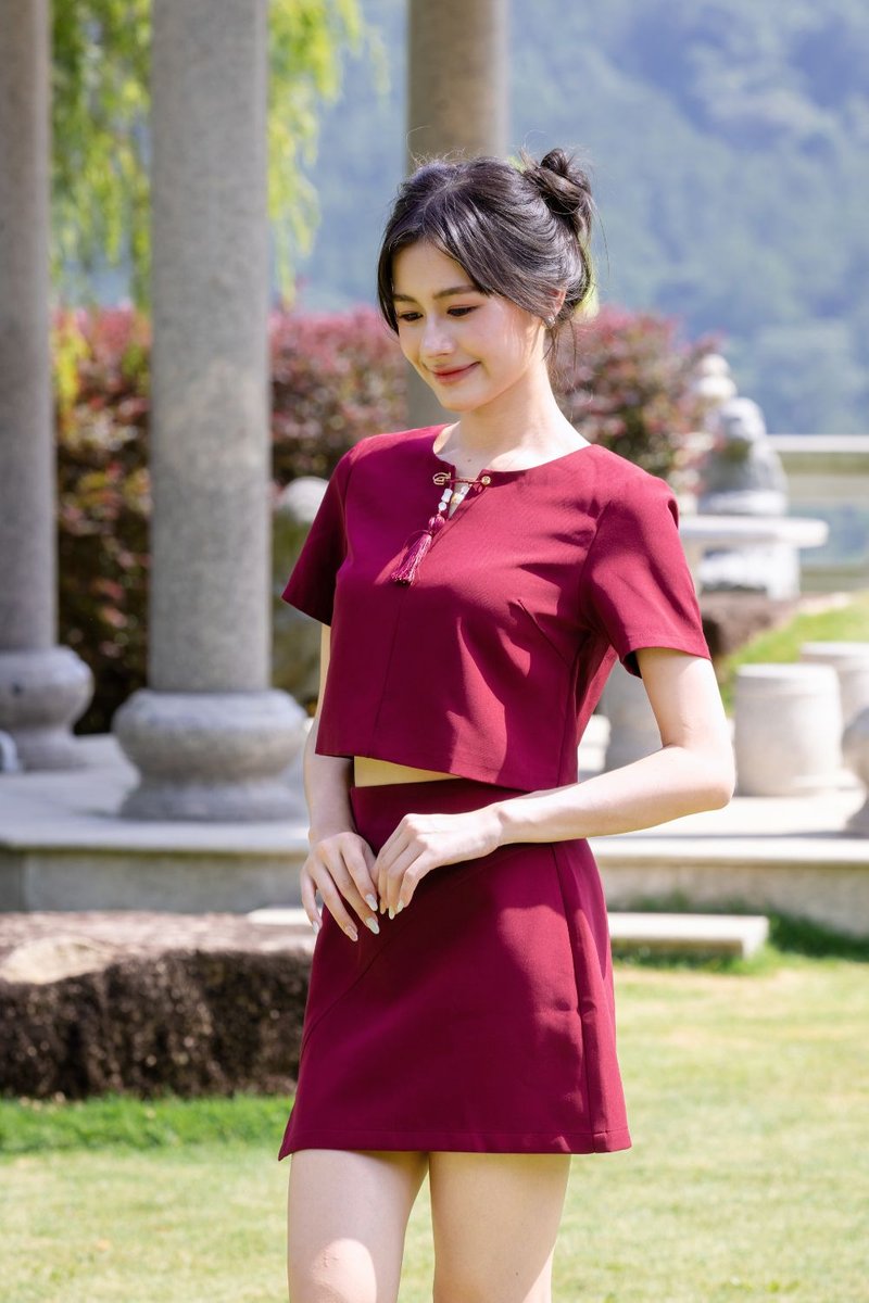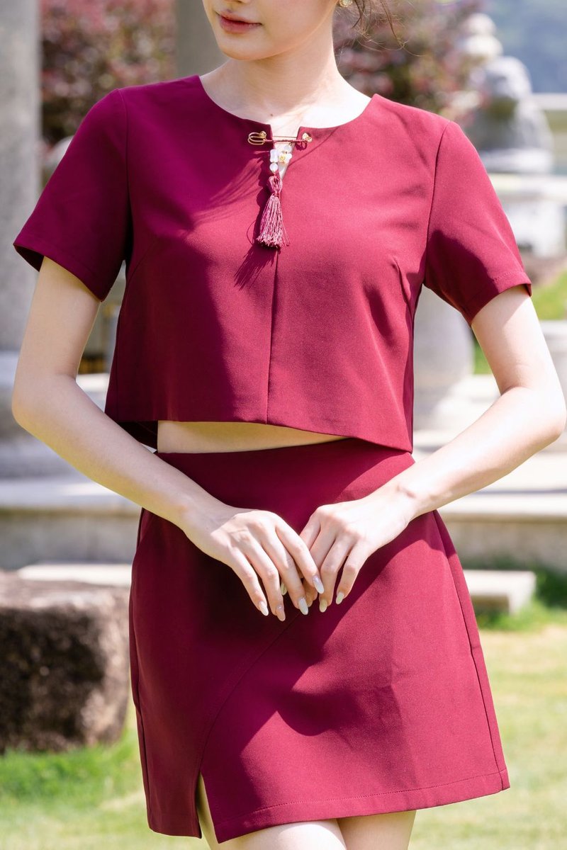 The Zeraphine Removable Chinese Tassel Pin Top is a versatile, oriental-inspired piece crafted from polyester-blend material. Designed to be paired with the Asymmetrical Slit A-Line Skirt, it features a handmade Chinese Tassel Pin that elevates a basic loose crop top with sleeves, adding festive charm while allowing you to continue styling the top even after Chinese New Year. The eyelet with a slit ensures the pin can be easily attached or removed. Fully lined at the bodice for comfort, the top is completed with an additional flyer under the metal zip to prevent direct contact with the skin, making it both practical and stylish.
