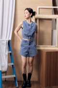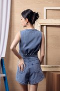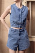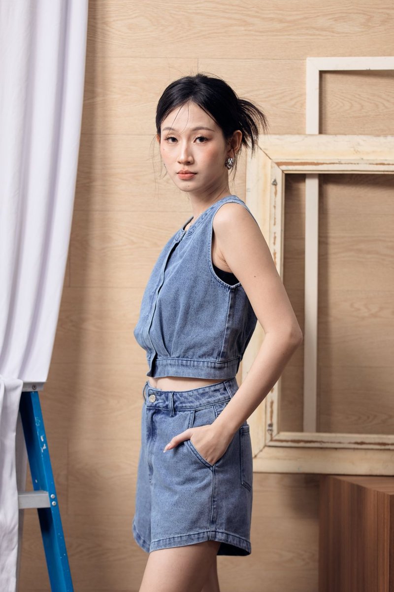 The Breanna Denim Vest Top blends clean structure with modern charm, crafted from a cotton-blend denim with a classic washed finish. Designed in a cropped silhouette with a round neckline and sleeveless cut, it delivers a sleek, contemporary look that’s easy to pair and style. The hidden front zip offers both function and a refined finish, while the elasticated back waistband provides comfort and shape. A pleated hem adds subtle movement and detail, elevating the minimal vest design. Unlined, non-sheer, and perfect on its own or layered, it pairs effortlessly with its matching bottom (43052505) for a coordinated denim fit.