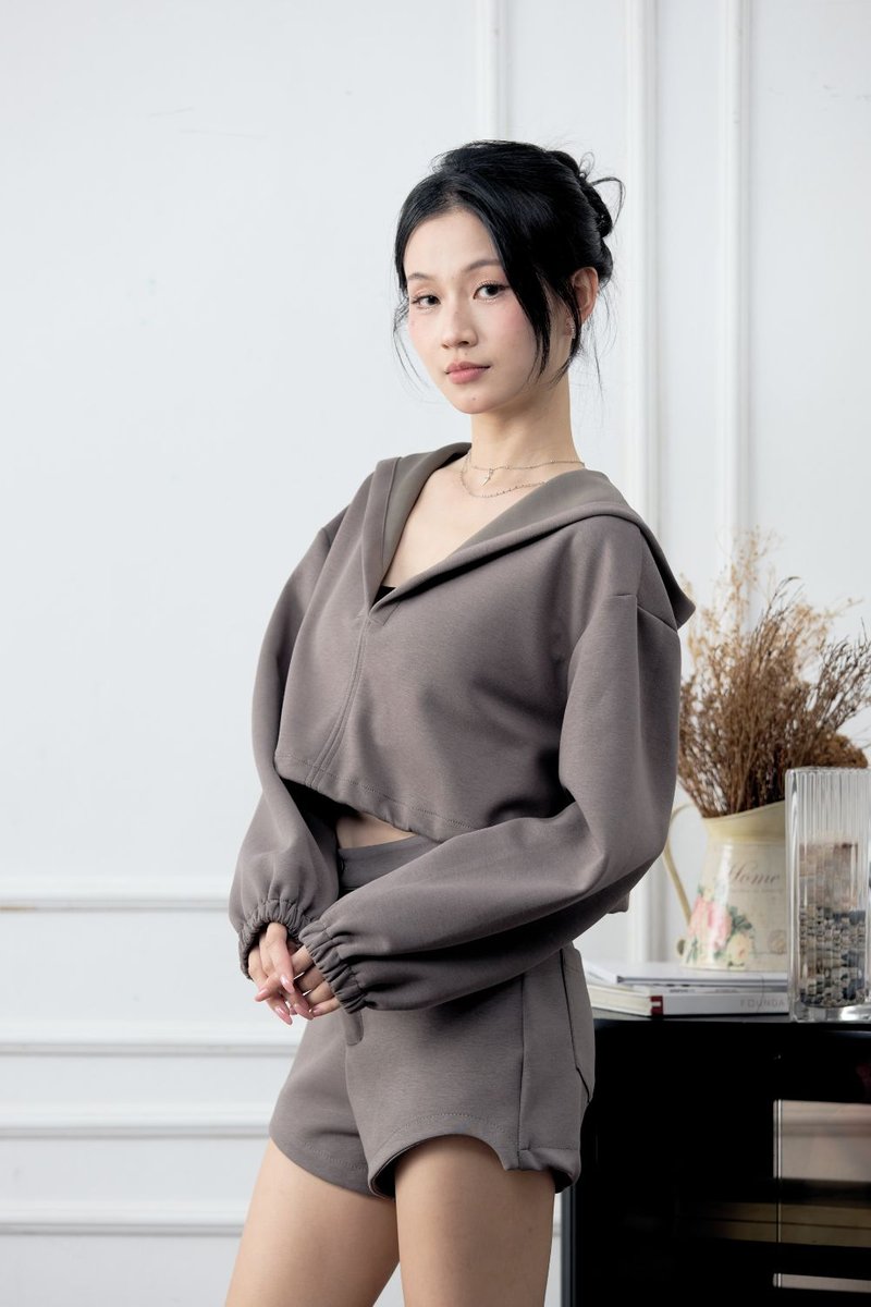 The Kaitlyn Cropped Hoodie brings a sporty yet feminine edge to your casual wardrobe. Designed in a cropped length with a slightly loose fit, it strikes the perfect balance between comfort and style. The V-neck design adds a flattering twist to the classic hoodie look, making it effortlessly chic for both lounging and going out. Featuring adjustable drawstrings at the hem for a customizable silhouette and elasticated cuffs for a neat finish, it ensures comfort and versatility. Made of polyester blend fabric with slight stretch, this hoodie offers softness, flexibility, and ease for everyday wear.