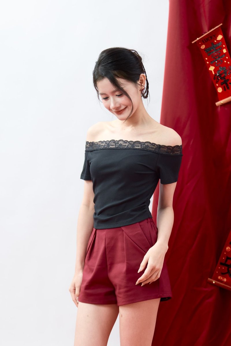 - Off-shoulder design with lace trim at the neckline