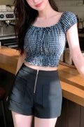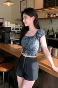A playful yet feminine piece designed for effortless styling. Made from structured checks fabric, this top features a versatile two-way wear design that lets you switch between on-shoulder or off-shoulder looks depending on your mood. The elastic shoulder detail and smocked hem create a flattering, slightly fitted silhouette, while the cropped length keeps it fresh and easy to style. Perfect for casual days or dressed-up moments with a chic twist.