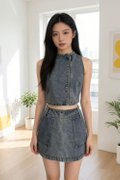 Calira Denim Sleeveless Top is a sleek denim top designed for a clean, modern silhouette. Made of mid weight denim fabric, non-stretch, it offers structure and durability. The dark acid wash effect adds a bold, contemporary edge, while the open-end metal zip in wearer front left side with inner zipper flap provides both functionality and comfort. Worn fitted, it flatters the figure with a sharp and polished look.