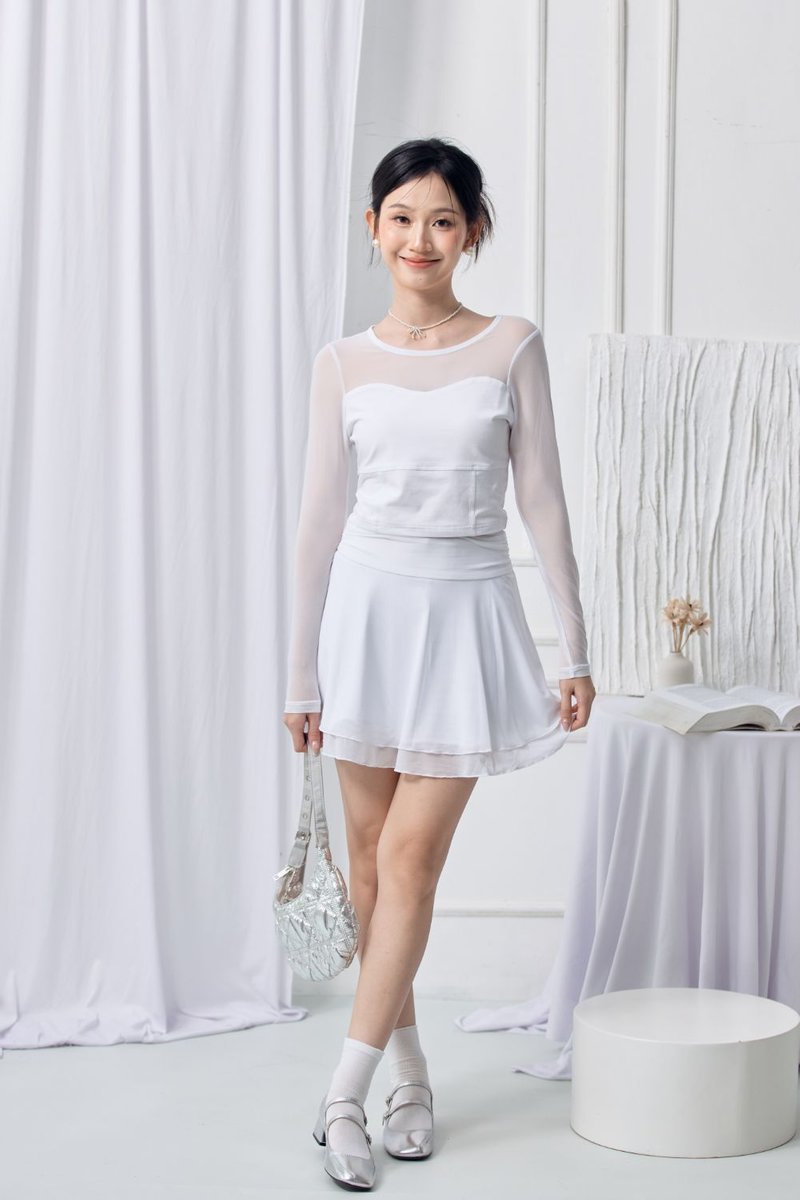 The Arynn Long Sleeve Top blends soft comfort with a sleek, modern edge. Featuring a cotton-polyester bodice that stays non-sheer and smooth, paired with semi-sheer mesh sleeves and upper panelling for an airy, elevated touch. The gently contoured fit and corset-inspired front paneling create a subtle sculpted look, finished in a cropped cut with a clean round neckline. Stretchy, unlined, and easy to wear on its own or styled with its matching bottom (43072501) for a coordinated outfit.
