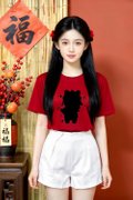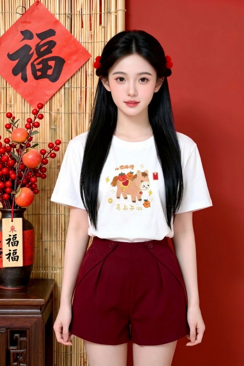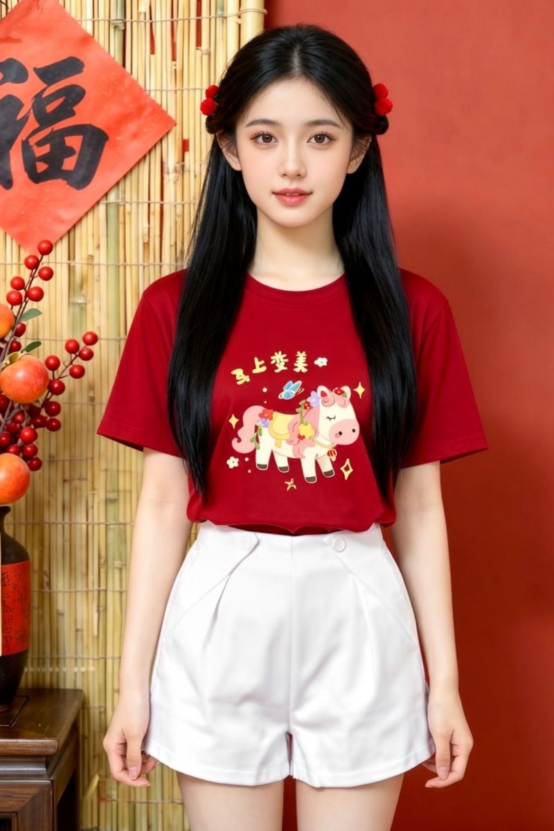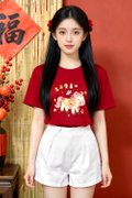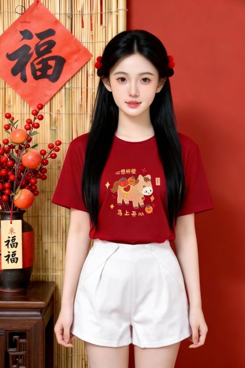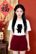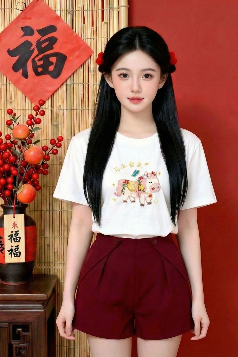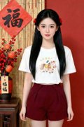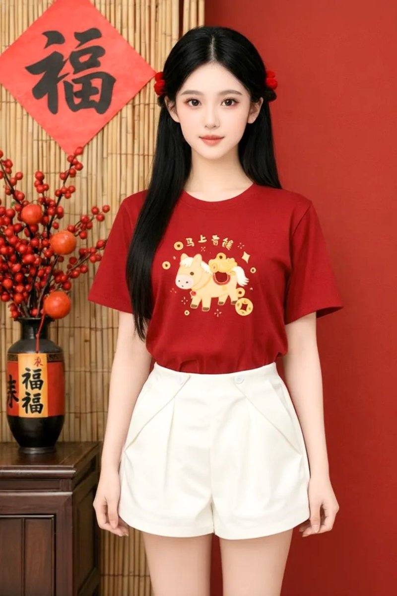 - Basic tee shirt silhouette with our hand drawn 钱钱马,美美马,橙橙马 and 福福马 embriodery graphic at front