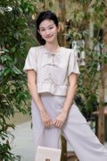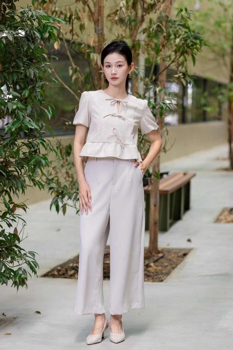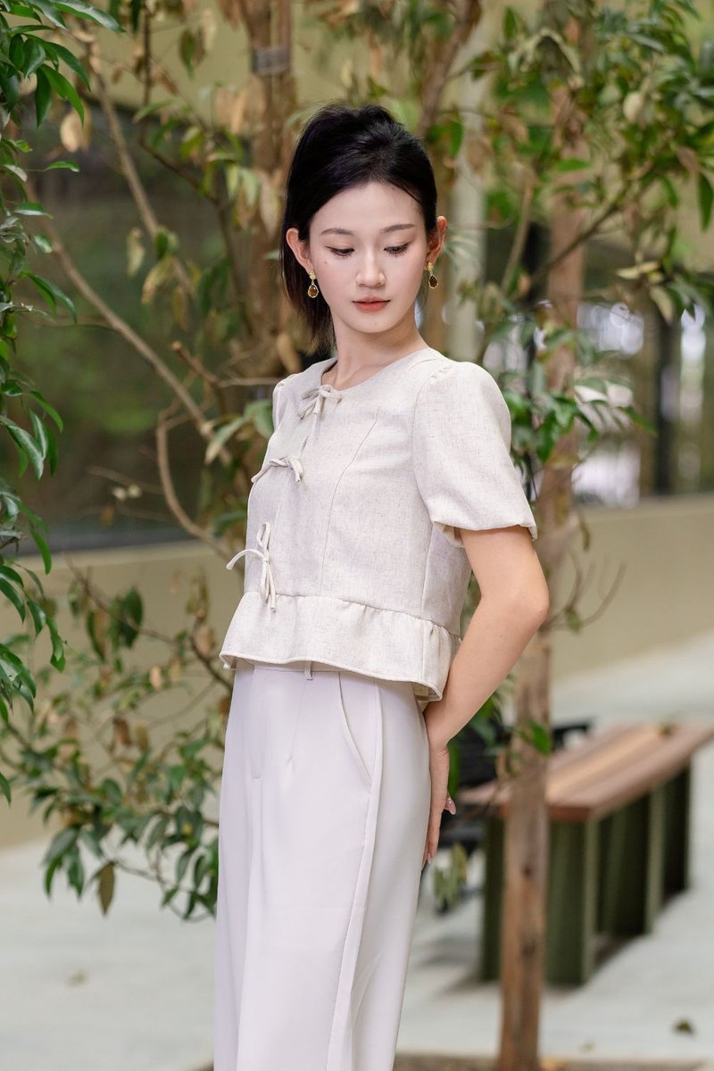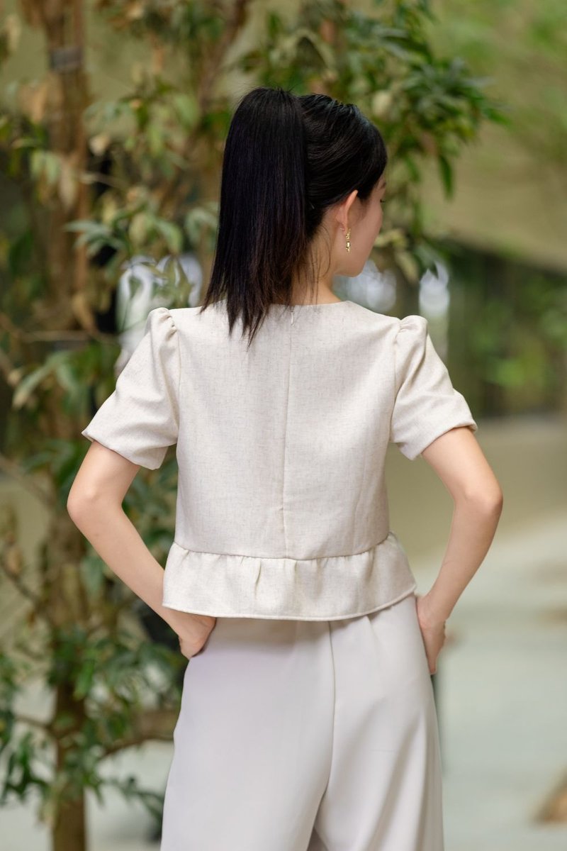 Althaea Peplum Top is a chic and structured top designed with feminine detailing for everyday elegance. Made of polyester blend textured suit fabric with light-weight, faux linen hand feel, it is unlined and non-sheer while maintaining a polished look. Non-stretch construction ensures a clean silhouette. Featuring puffed sleeve with elasticated cuff and self-tie ribbon details at front, it adds delicate charm. The ruffle design at hem creates subtle volume, while the slightly relaxed fit and regular length ensure comfortable wear. Finished with a round neckline and concealed zip at back for a seamless finish.