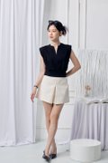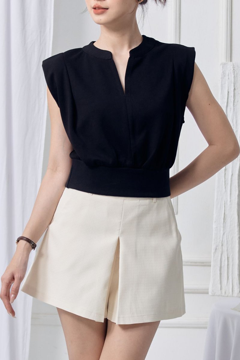 The Aralyn Cap Sleeve Pleated Shoulder Knit Top is where elegance meets everyday ease. Made of jersey knit material with stretch, it offers a soft and flexible fit that flatters every shape. Designed with sophisticated pleated shoulders and finished with a cap sleeve design, it adds structure and a refined touch to your outfit. The mandarin collar with a V-slit provides both style and neck comfort, while subtle gathers at the waistline create gentle volume for a balanced silhouette. Completed with a snug ribbed hem to accentuate the waist and figure, this cropped, slightly fitted top is perfect for both work and casual occasions.