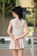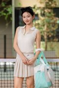Calyra Athleisure Mesh Tank Polo Top is a sporty statement piece designed with breathable texture and modern detailing. Made of thin soft mesh material with knit ribbing, it delivers a lightweight and comfortable feel. The centerfront mesh is sheer and need to style with own inner piece (inner not included), allowing versatile layering options. Finished with knit hem material to snug in the loose silhouette, it balances structure and ease. The knit ribbing has contrast lines to elevate the sporty look, while the polo zip collar design adds a classic athletic touch. Worn slightly oversize for a relaxed athleisure vibe.