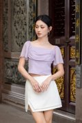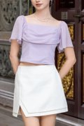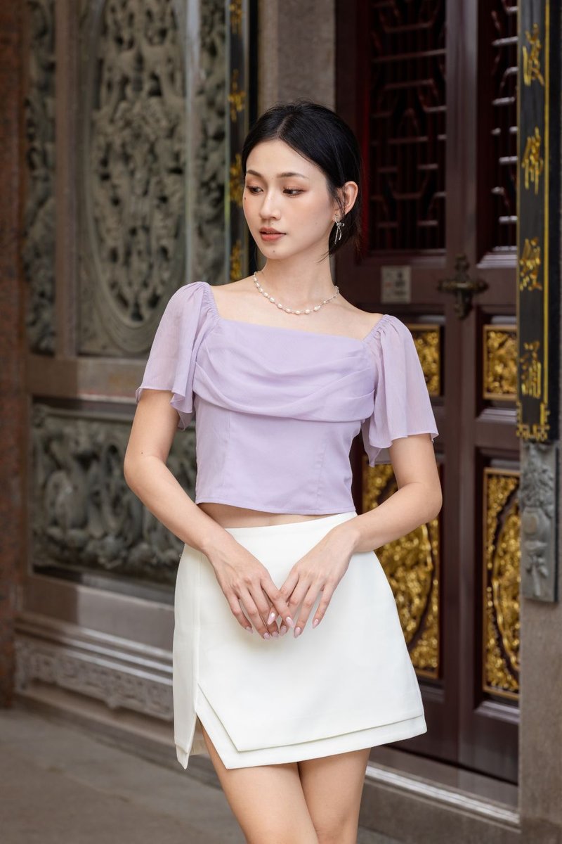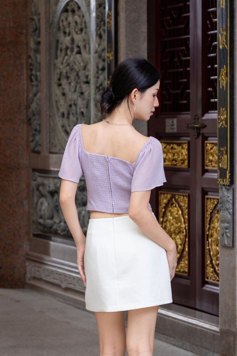 Elina Textured Chiffon Cropped Top is a feminine and elegant piece designed with soft structure and flow. Crafted from polyester-blend textured chiffon, it features a fully lined, non-sheer construction with a non-stretch finish for a polished look. The square neckline is complemented by flutter sleeves with elasticated shoulder bands, adding a light and airy movement. Designed with a cropped length and a slightly fitted silhouette, the top is enhanced with flowy shirred panel detailing at the front and dart detailing for a flattering, feminine shape. Finished with elasticated smocking at the back, it offers both comfort and a refined fit.
