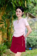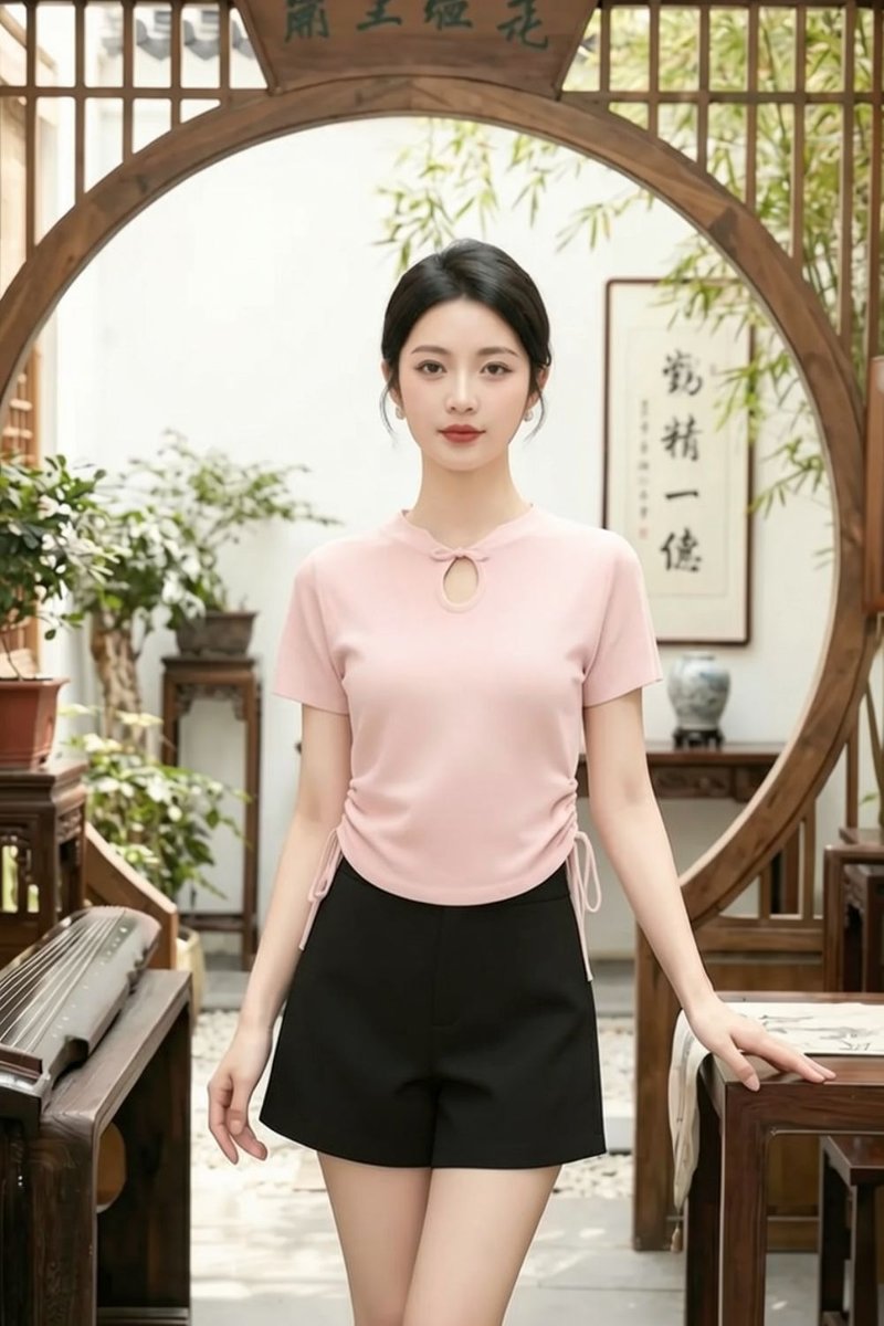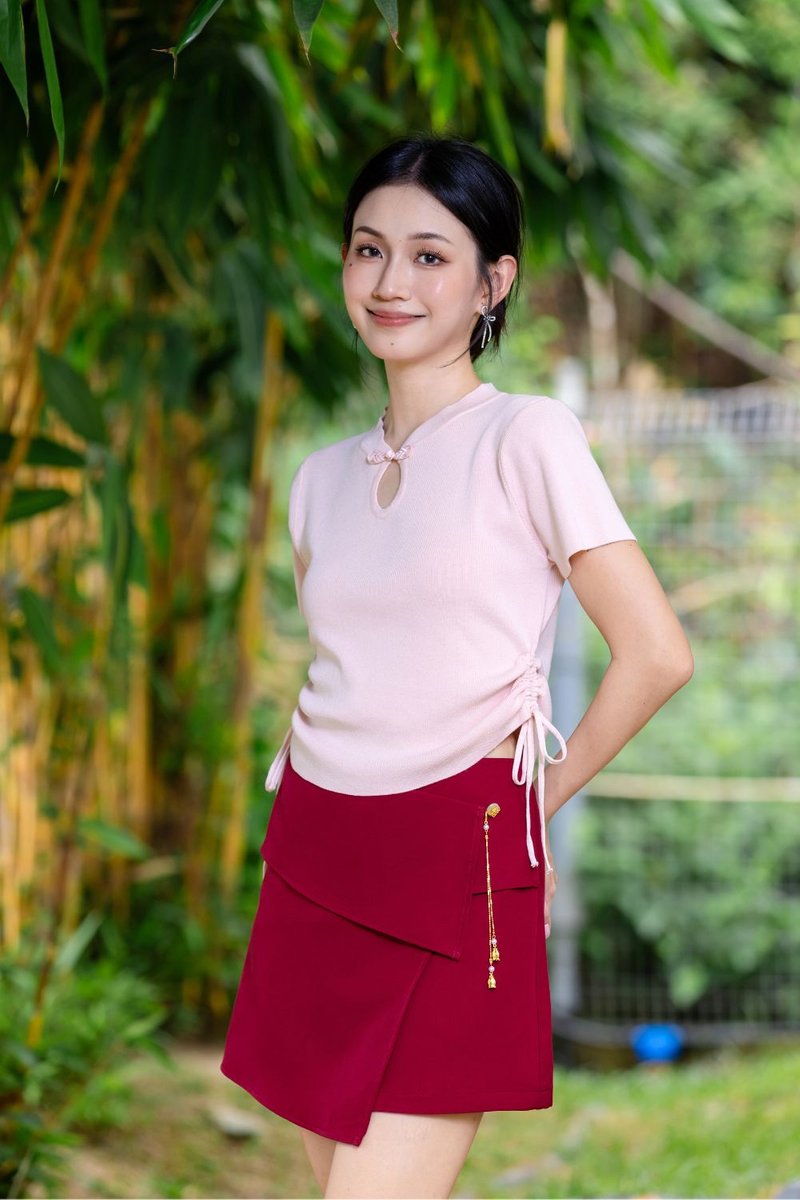 Gracielle Ruched Drawstring Knit Cheongsam Top is a modern cheongsam-inspired knit top designed to balance elegance and comfort effortlessly. Made of specifically knit material with stretch, this piece offers a soft, flexible fit that moves with the body while maintaining a refined silhouette. The thickness is thoughtfully adjusted to suit for Singapore weather, making it breathable and comfortable for all-day wear. Featuring a mandarin collar with Chinese knot, it brings a subtle oriental touch to a contemporary knit design. The length can be adjusted with the ruched drawstring design at both sides, allowing for versatile styling and personalized fit. Worn slightly fitted but comfortable because of high stretch, it flatters the figure without feeling restrictive.