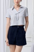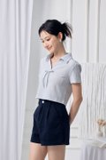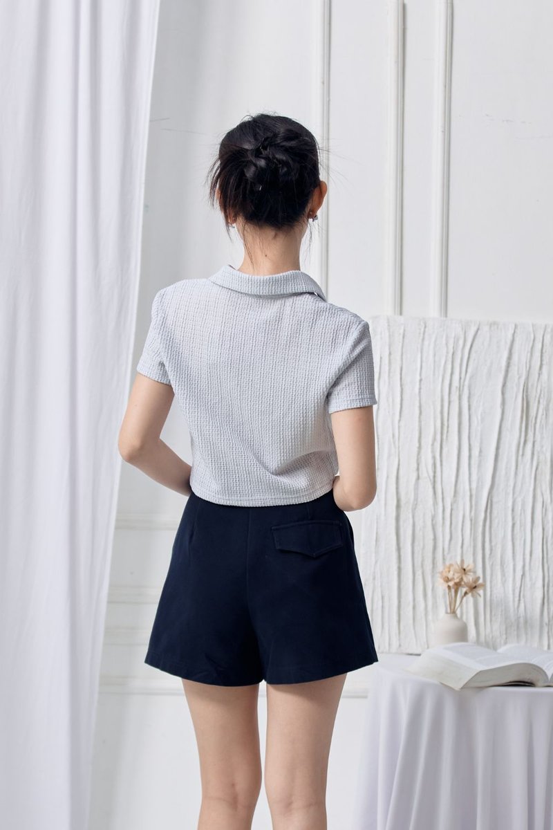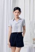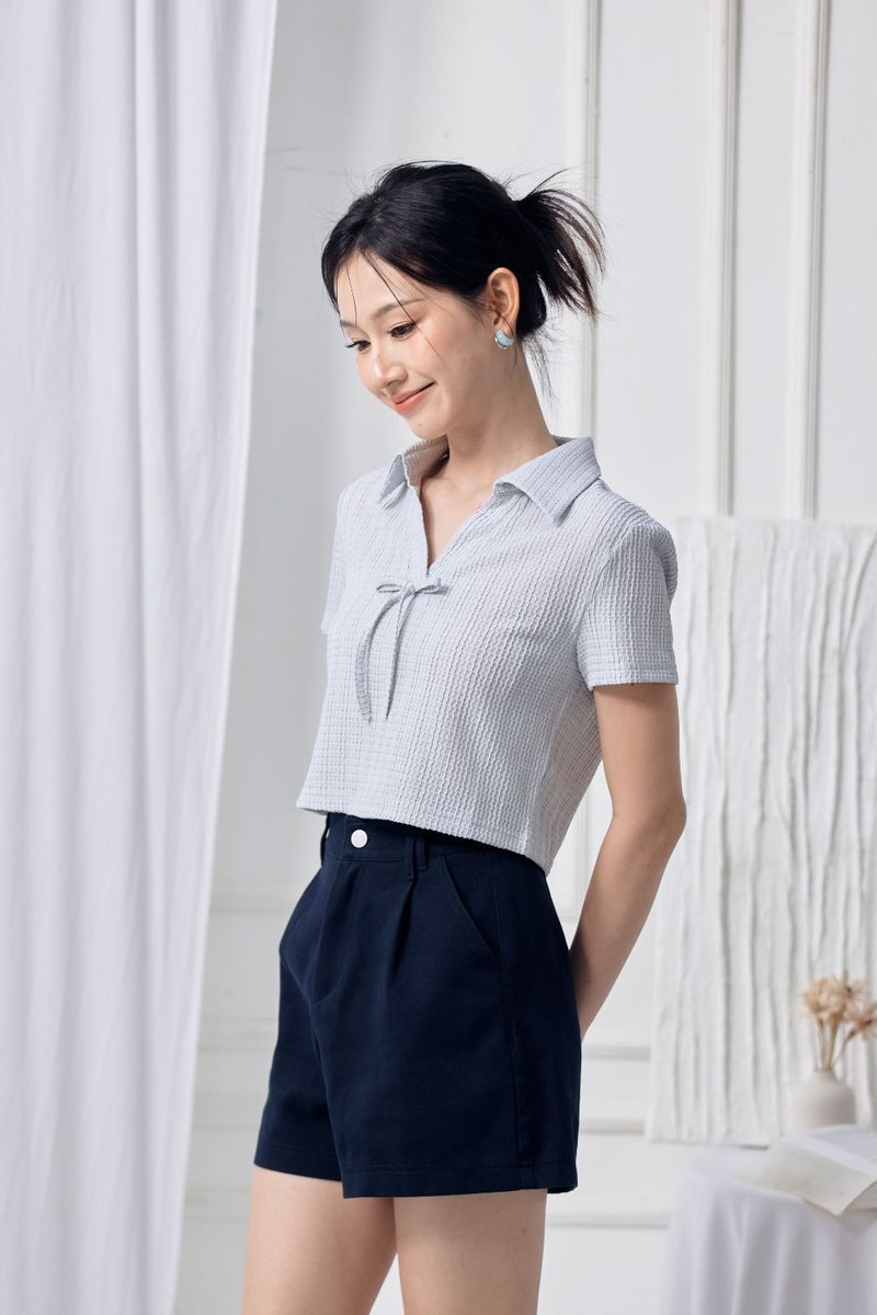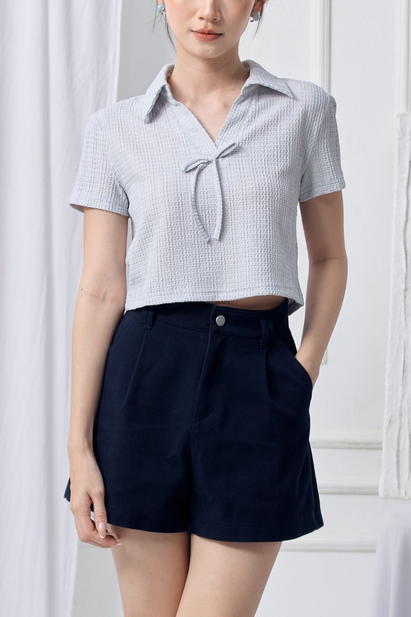 The Hailey Textured Collared Top is a chic and modern piece that blends casual comfort with polished style. Made of polyester blend textured fabric with mid stretch, it provides a soft yet structured fit that moves effortlessly with you. Designed in a cropped length with a collared neckline, it adds a touch of sophistication while maintaining an easygoing vibe. The slightly loose silhouette offers a relaxed feel, and the decorative ribbon at the center front lends a playful, feminine accent. Perfect for pairing with high-waisted bottoms for a balanced, trendy look.