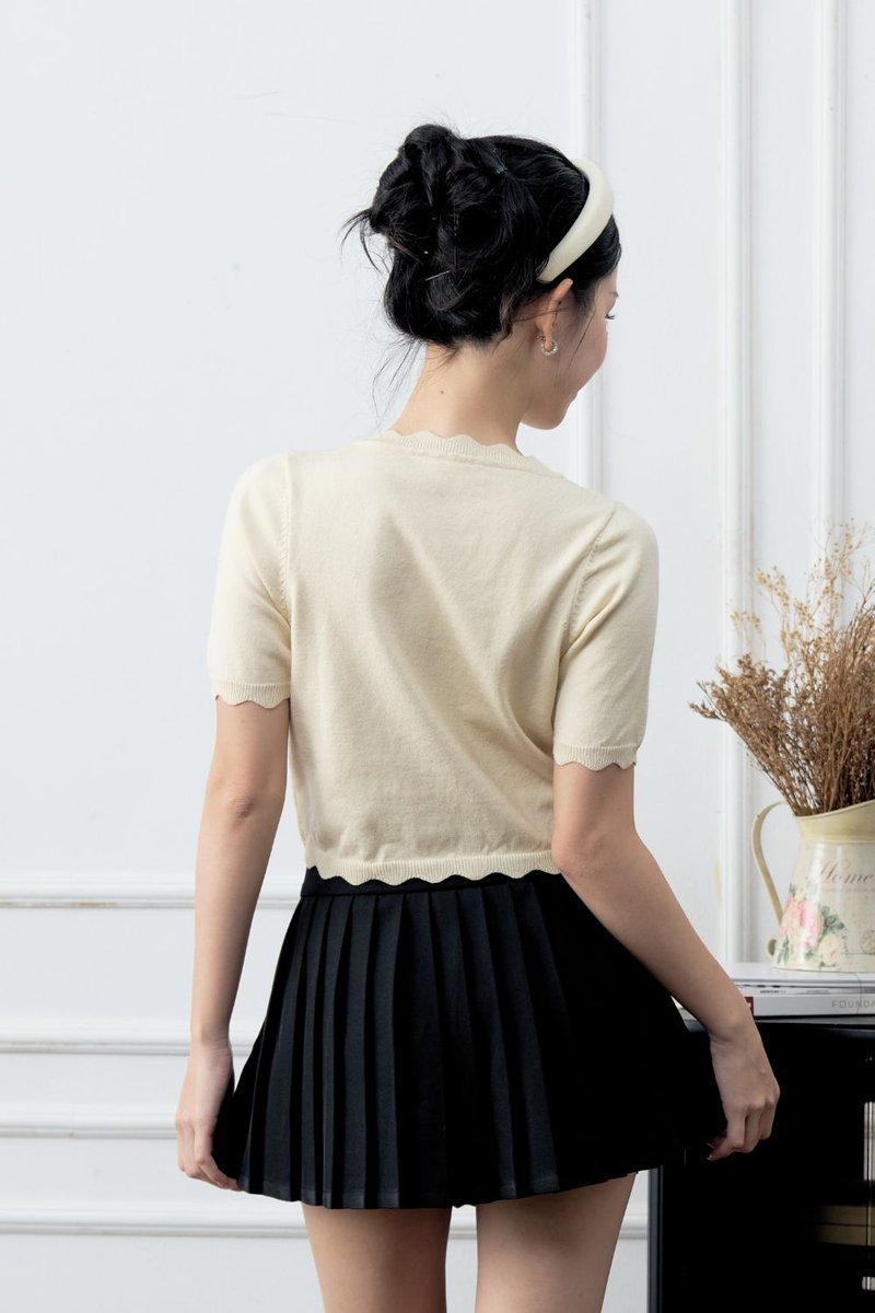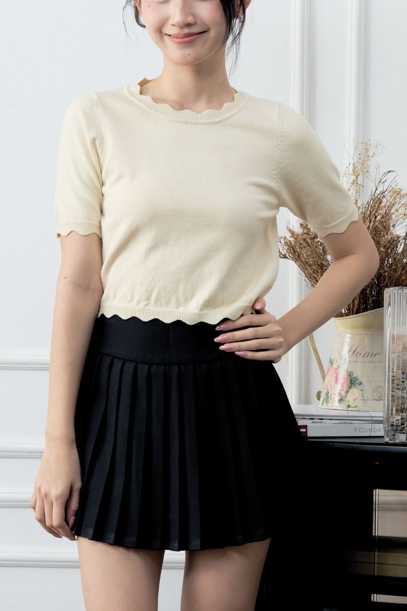 The Joelle Scallop Knit Top is a refined yet comfortable staple, crafted from soft knit material for everyday wear. Designed with scallop ribbing along the collar, sleeves, and hem, it adds subtle texture and an elevated finish to a classic silhouette. The slightly longer sleeves provide gentle coverage for the arms, while the cropped length and slightly fitted cut create a flattering, modern shape. Versatile and easy to style, this knit top pairs beautifully with high-waisted bottoms for a chic, effortless look.