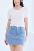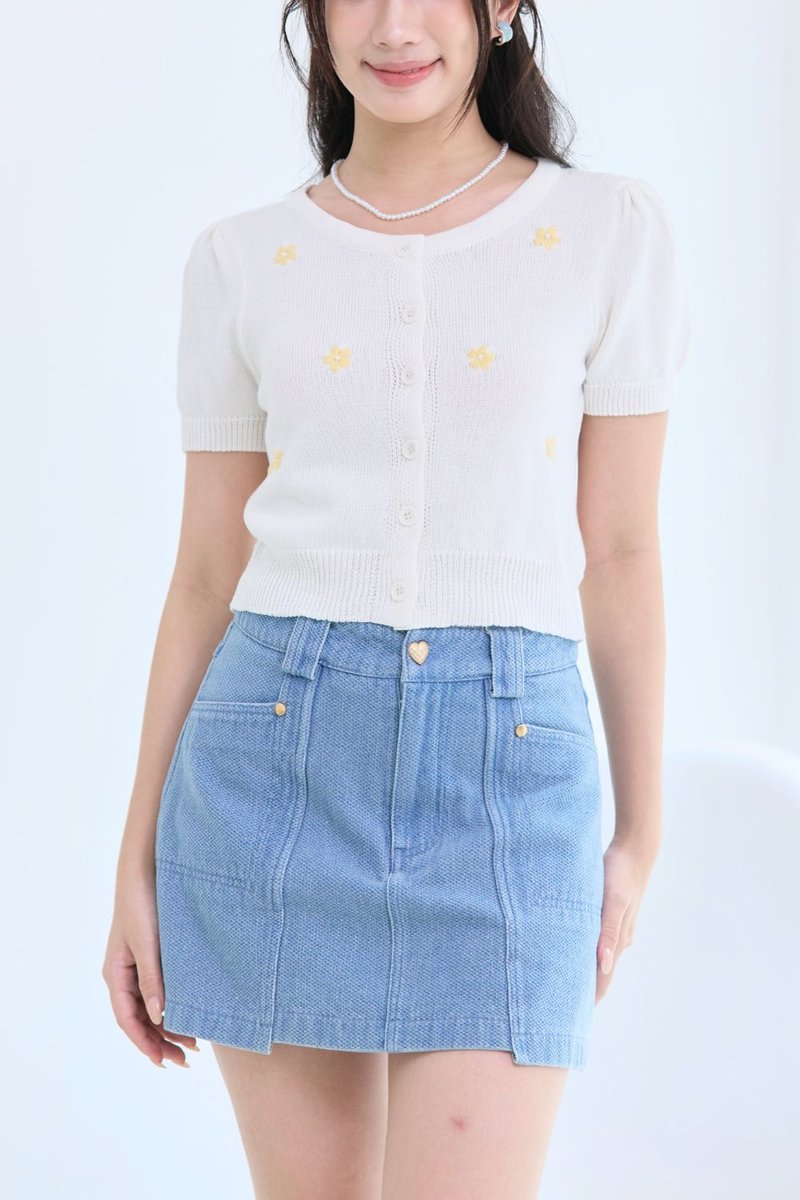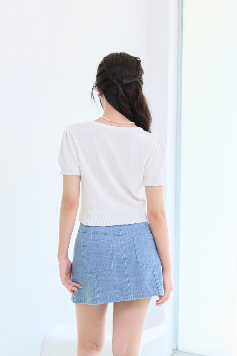Romantic detailing meets everyday comfort in the Marivelle Floral Knit Top. Featuring a wide rounded neckline and softly puffed sleeves with gentle gathers at the sleevehead, it frames the silhouette with feminine ease. The functional centre-front button placket is adorned with contrast floral embroidery, adding artisanal charm to the piece. Crafted from a soft, breathable medium-gauge knit, it offers a clean finish with subtle stretch, worn slightly fitted for a flattering, polished look.