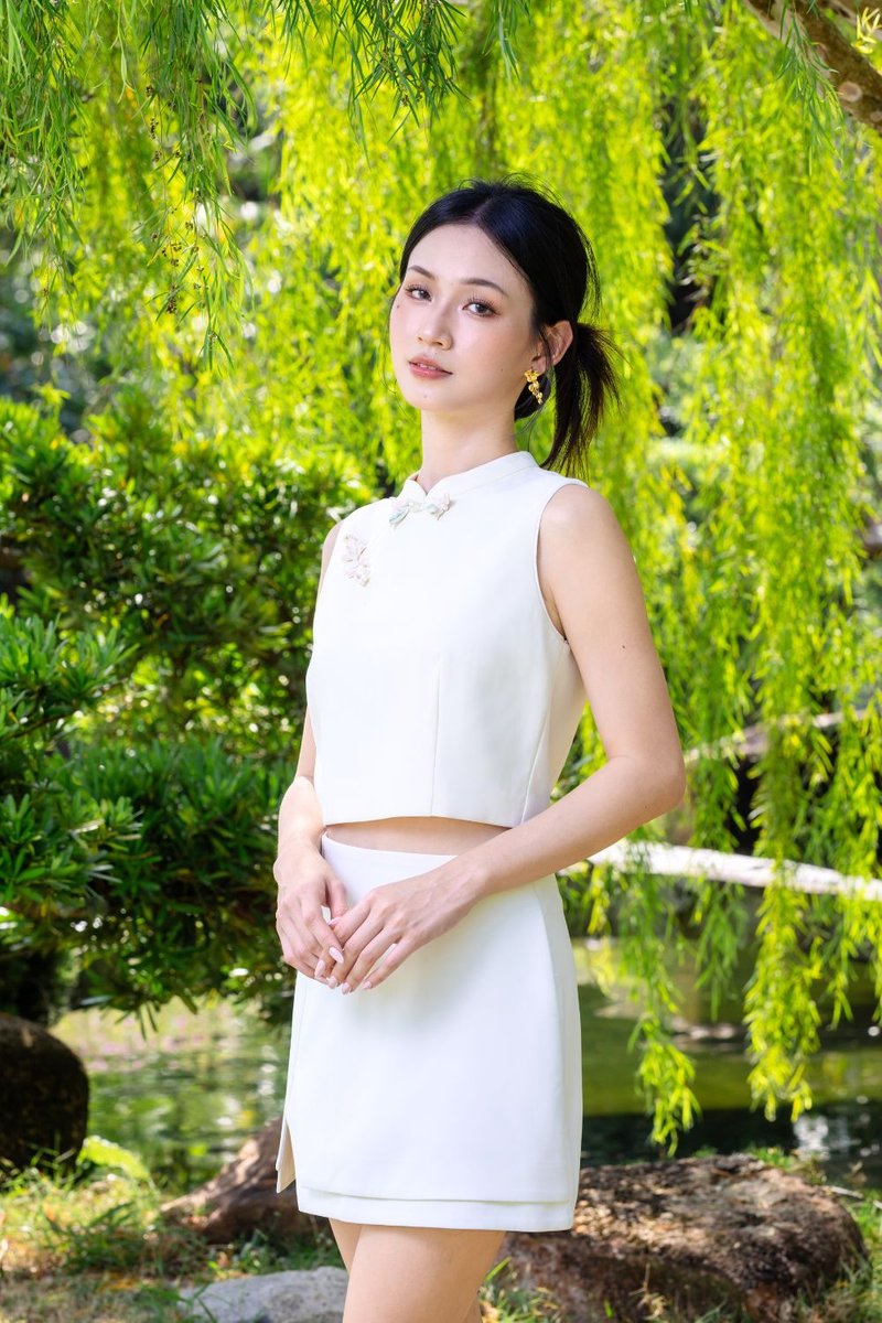 The Orlaya Intricate Chinese Knot Cheongsam Sleeveless Top is a refined, oriental-inspired piece crafted from polyester-blend material for a polished and structured look. The fabric undergoes interfacing to enhance structure and elevate the quality appearance. Designed with a mandarin collar featuring scallop piping details and intricate Chinese knot buttons, this sleeveless cheongsam top exudes elegance and traditional charm. Same-color piping is used throughout for a cohesive, premium finish. An open-end metal zip ensures convenient wear, while an additional flyer under the zip prevents direct contact with the skin for comfort. Fully lined, slightly fitted, and cropped in length, this top offers a flattering silhouette for both festive and contemporary styling.