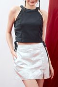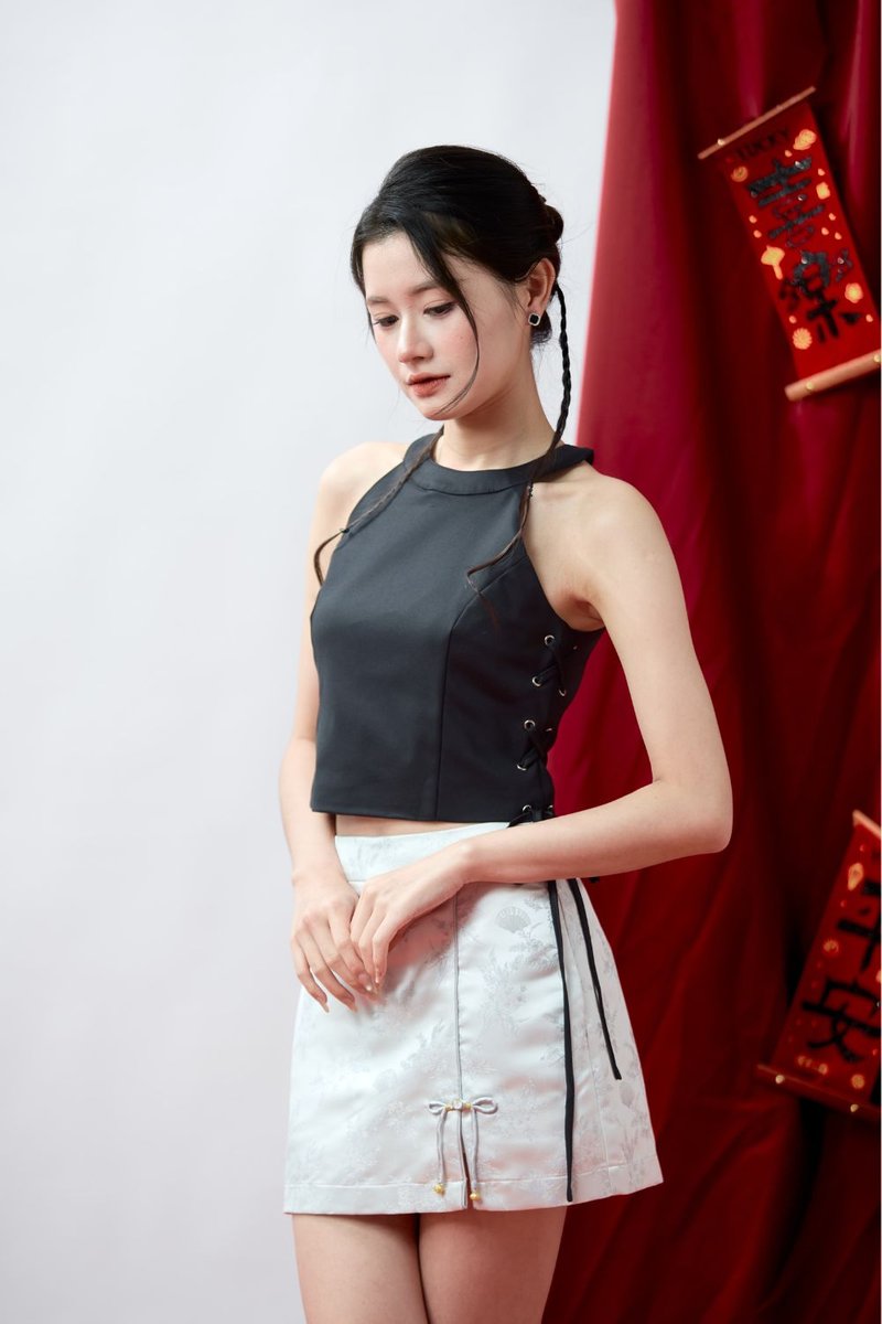 Eirlys Top is a chic, modern staple crafted from a polyester-blend mid-weight fabric with slight stretch for comfortable wear. Designed with a fitted silhouette, this sleeveless top features a halter neck with high collar and stylish side lacing details for a subtle statement. Non-sheer and finished with a back zip for easy wear, it sits at a cropped length, making it perfect for pairing with high-waisted bottoms for a contemporary, polished look.